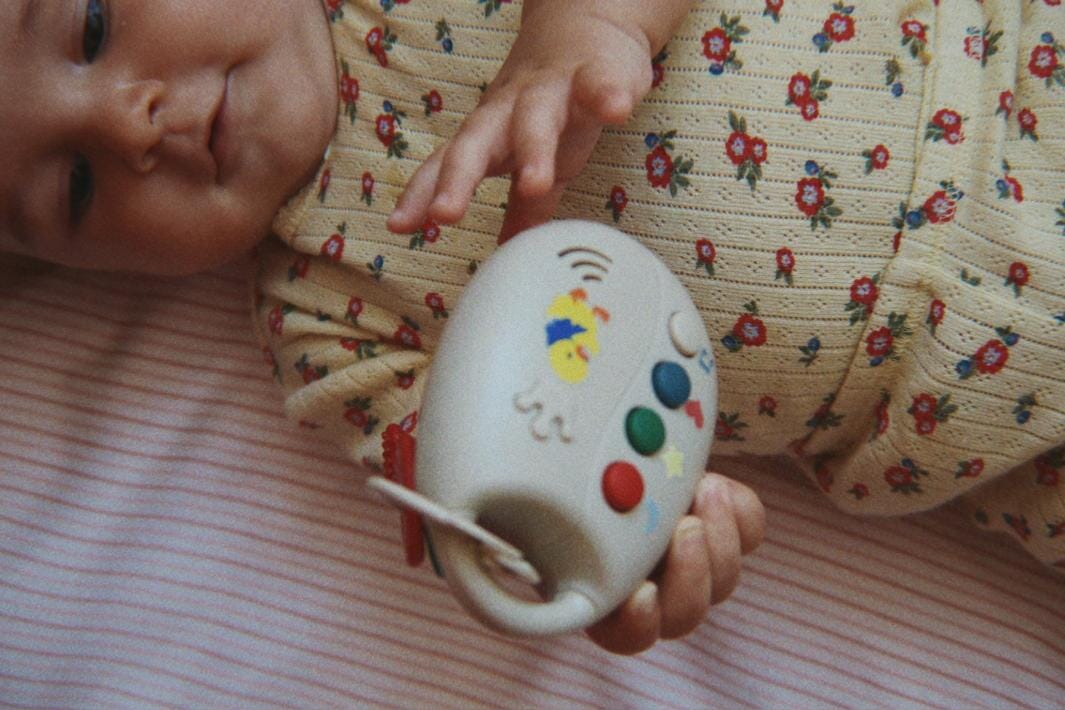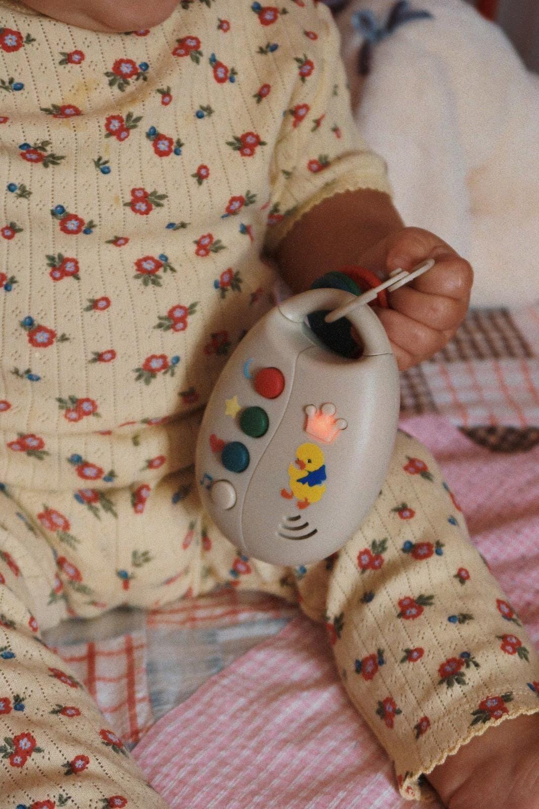 Lekenøkler fra Konges Sløjd med tre nøkler i rødt, grønt og blått, festet til en ring. Leken har knapper med symboler som måne, stjerne og hjerte samt illustrasjoner av en and og en krone.