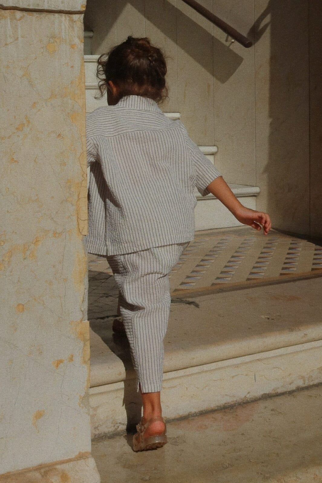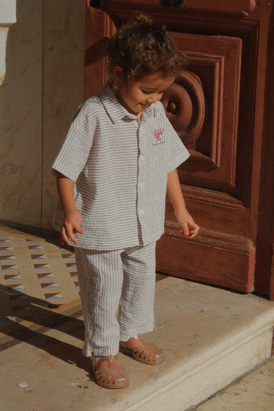 Stripet skjorte fra Konges Sløjd med blå striper på lys beige bakgrunn. Skjorten har korte ermer, skjortekrage og rødt broderi med RHW og Konges Sløjd-logo på brystet.