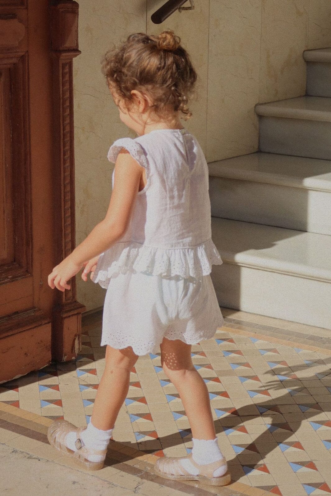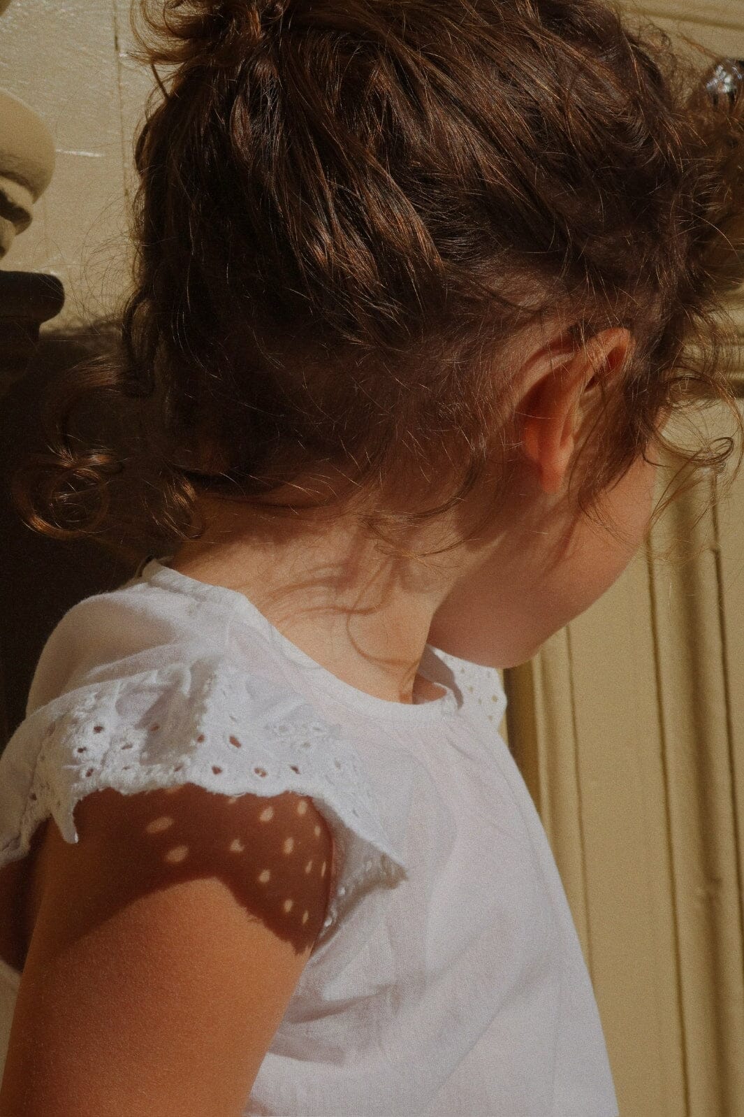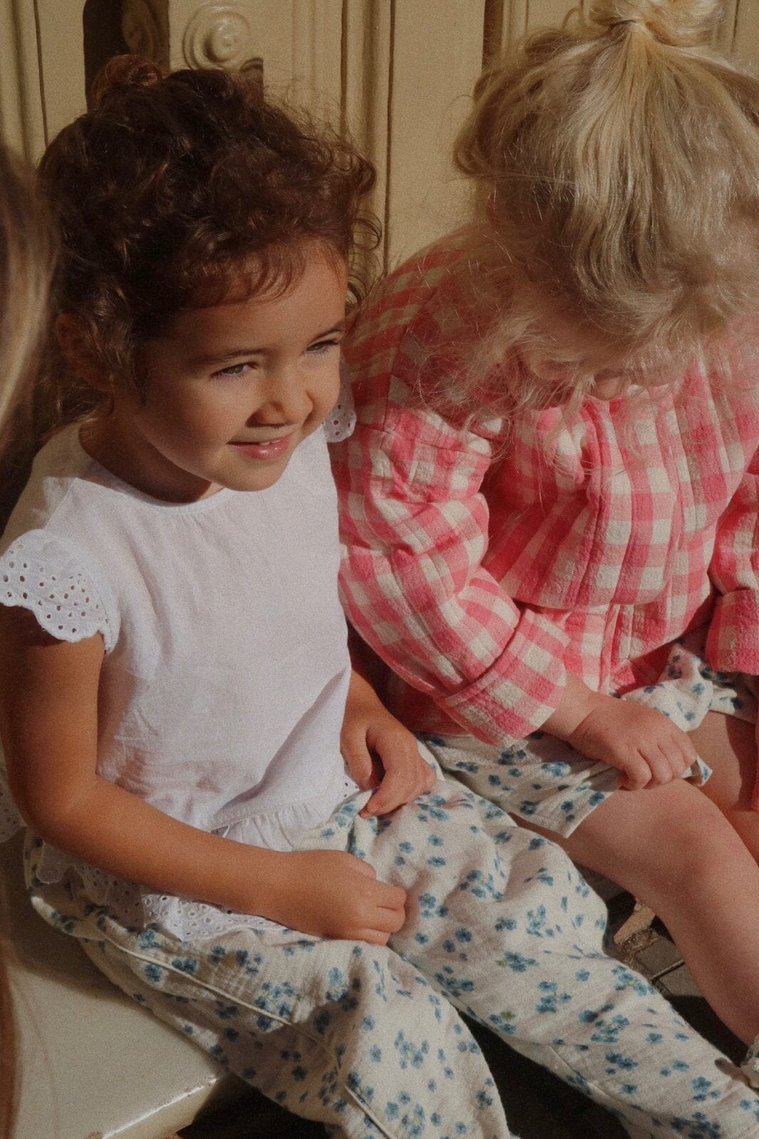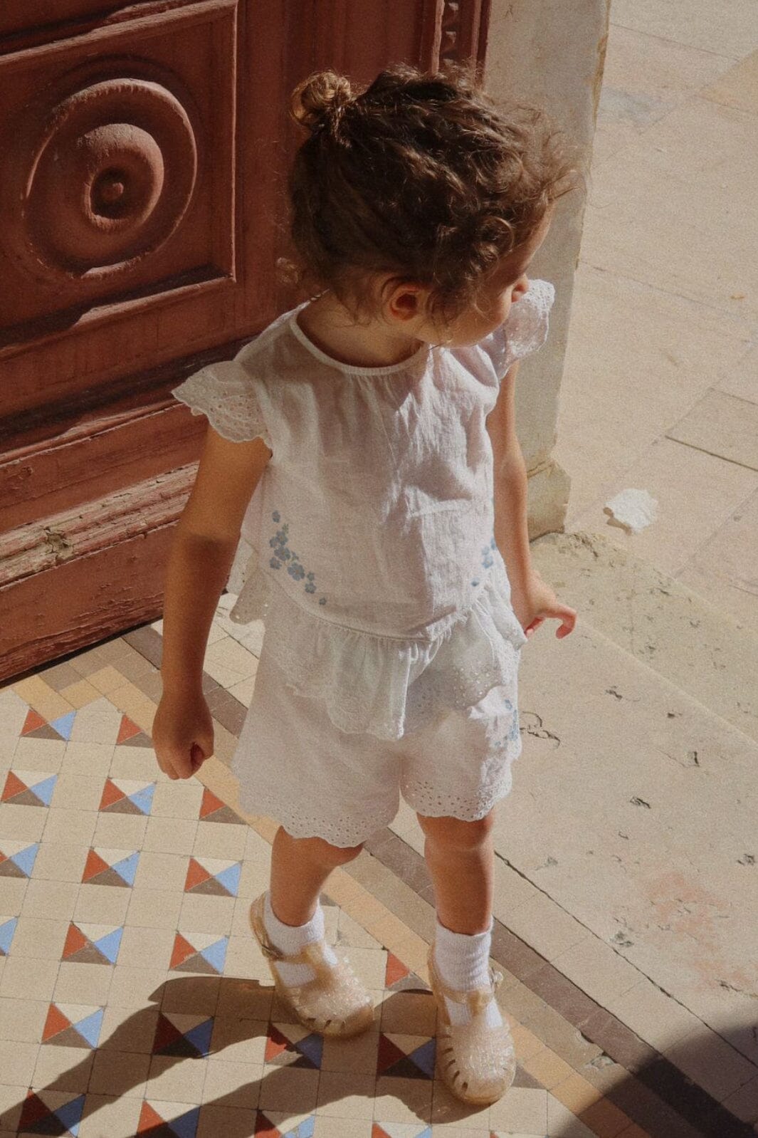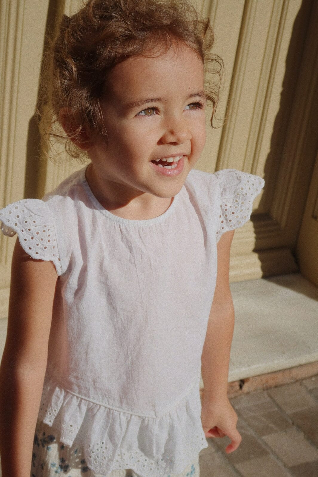 Hvit topp fra Konges Sløjd med broderte hull og volanger. Toppen har rund halsutskjæring og korte ermer med volanger i kanten.