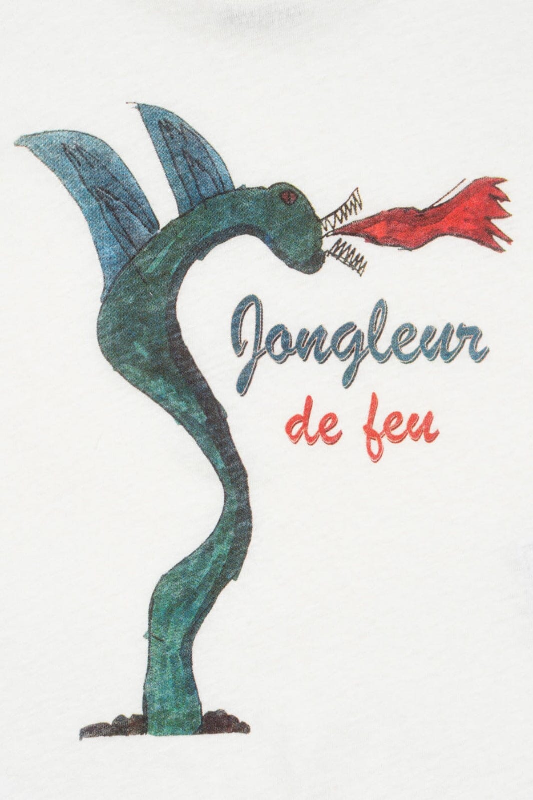 Det fargerike trykket med den grønne dragen og den røde flammen skaper et lekent uttrykk på den hvite bakgrunnen. Den franske teksten tilfører et kunstnerisk element.