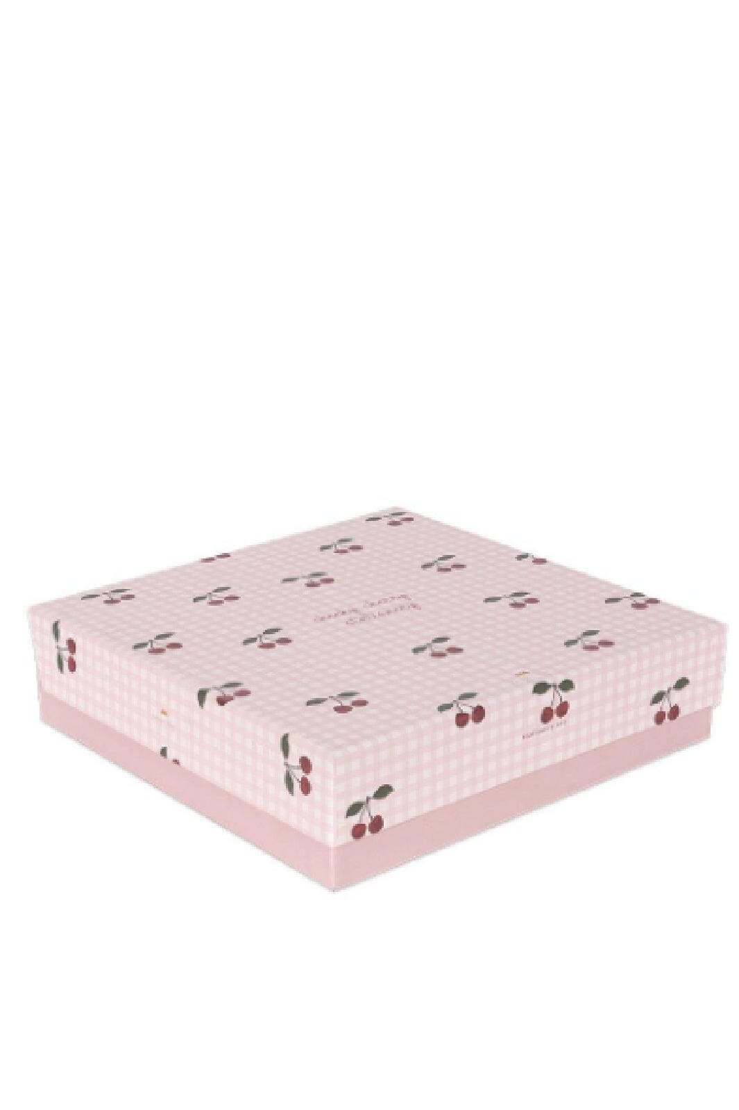 Boksen har et rutete mønster og kirsebærmotiver som passer til innholdet og gjør det lett å kjenne igjen settet blant andre ting.