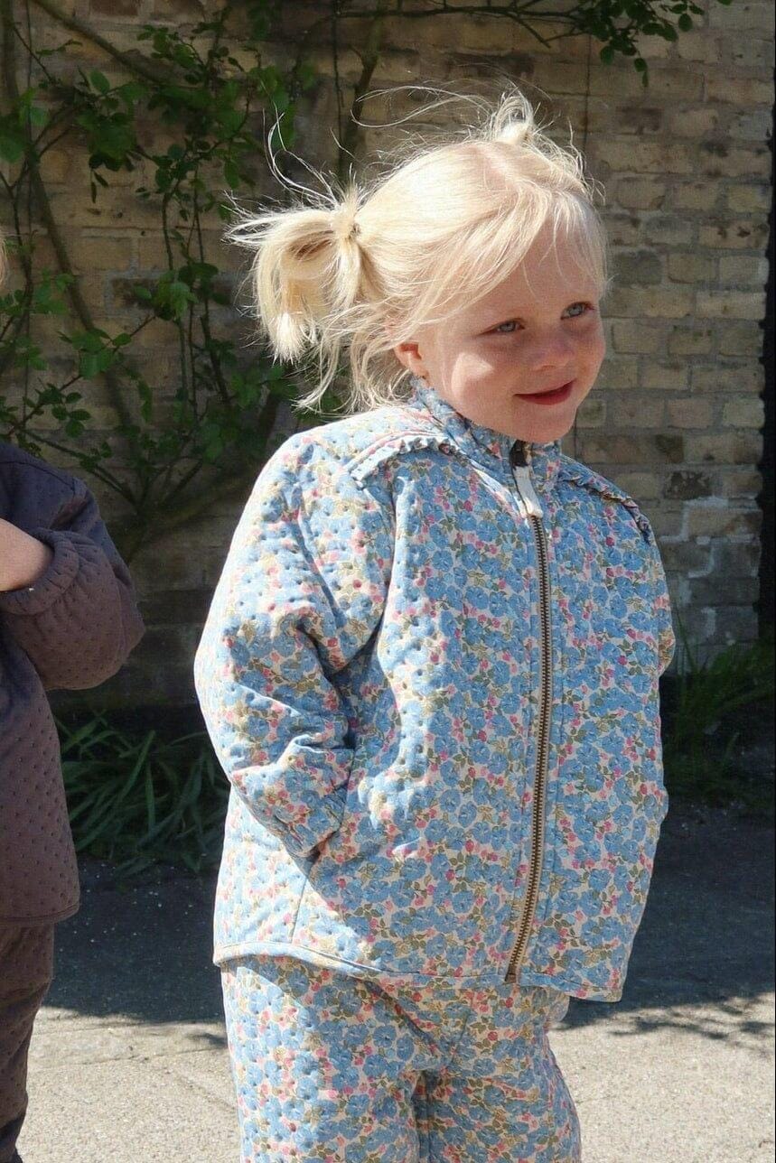 Termojakke fra Konges Sløjd med blomstermønster i blå, rosa og grønne nyanser. Jakken har volanger på ryggen og en glidelås foran.