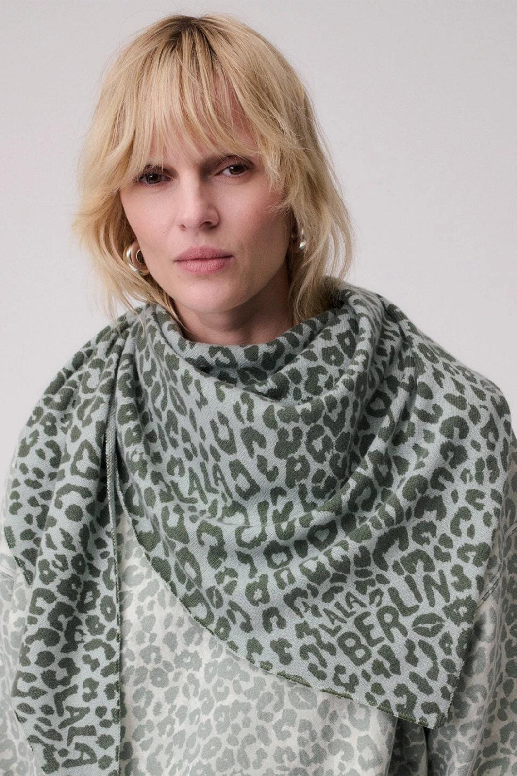 Trekantet skjerf fra Lala Berlin, laget av trykt kasjmir med leopardmønster i grønne nyanser. Skjerfet har en trekantet form med Lala Berlin-branding.