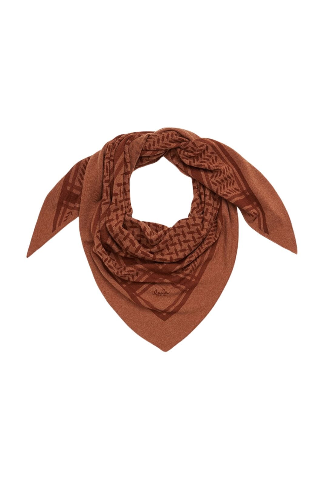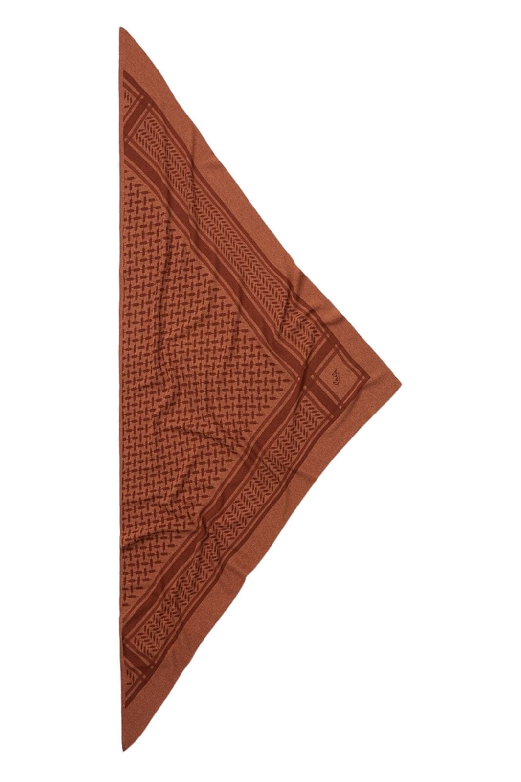 .Trekantet skjerf fra Lala Berlin i brun. Laget av kasjmir med fiskebensmønster og trykk langs kantene. Det trekantede designet gjør skjerfet enkelt å style på forskjellige måter.