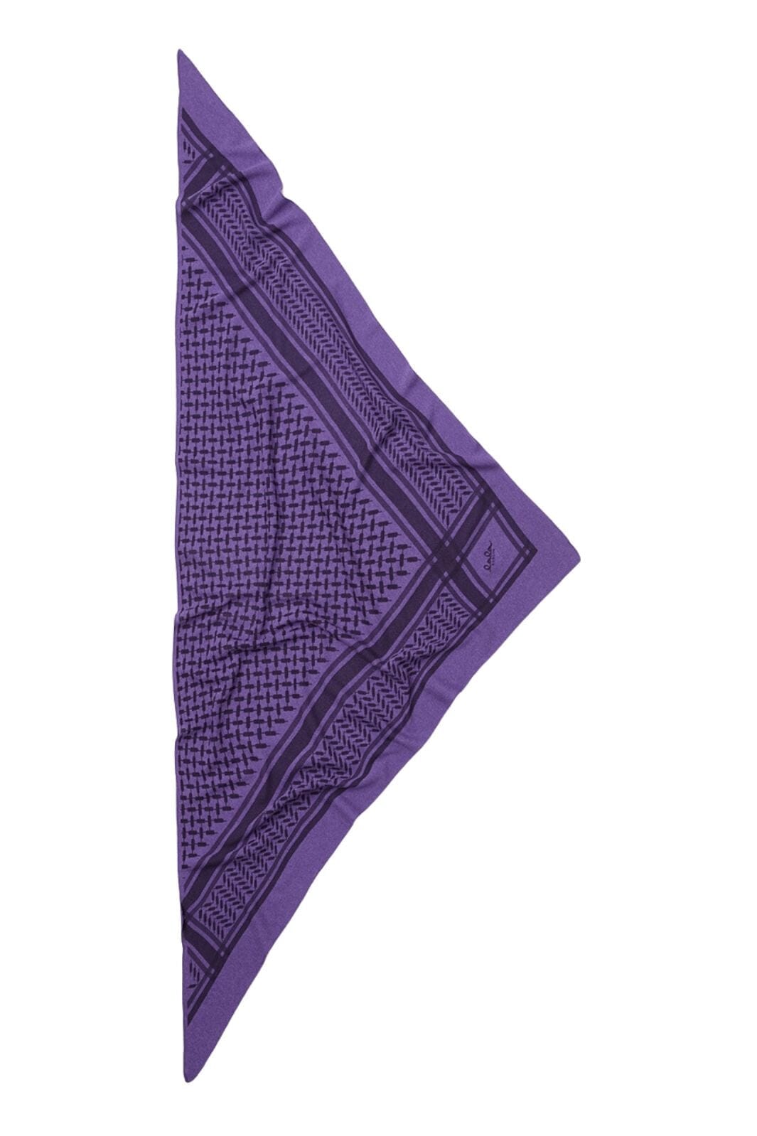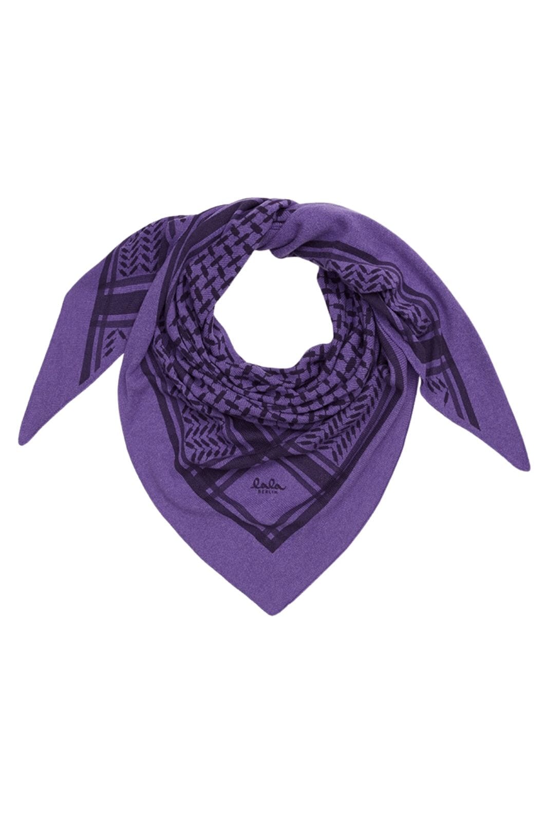 .Trekantet skjerf fra Lala Berlin i lilla med fiskebensmønster og trykk. Skjerfet er laget av kasjmir, noe som gir en myk og varm følelse mot huden.