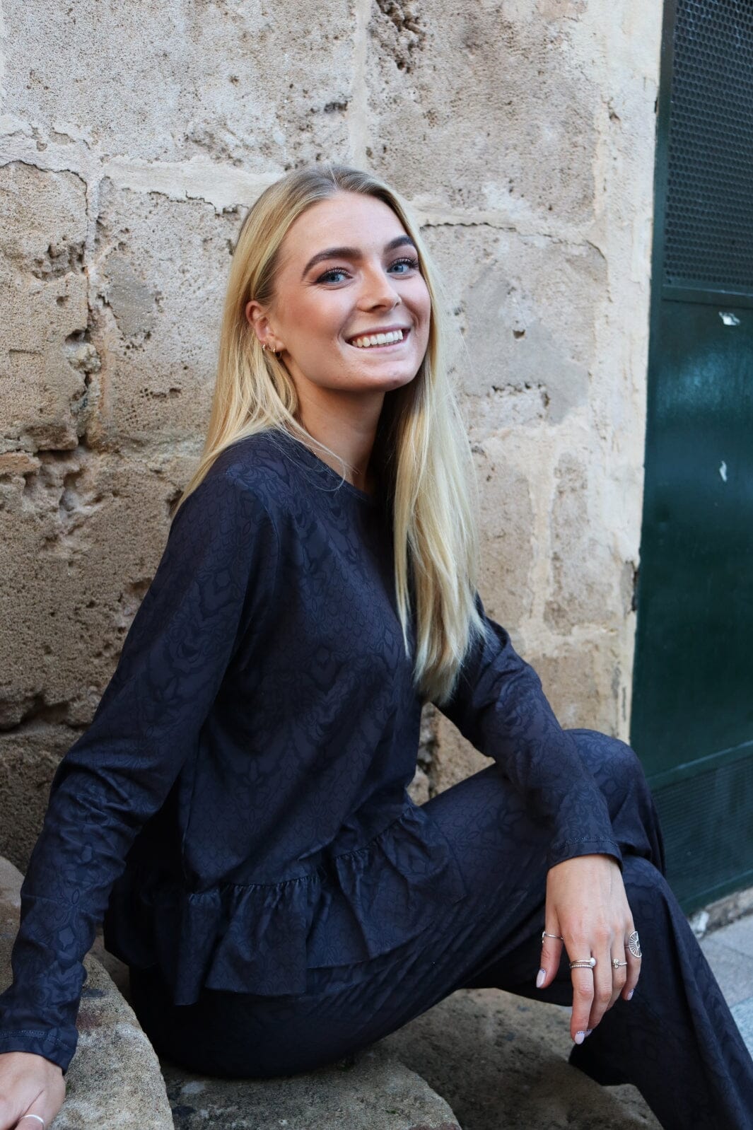 Mørkegrå langermet t-skjorte fra Liberte med volangdetaljer ved midjen. T-skjorten har rund halsutskjæring og er laget i Alma-kvaliteten med et mykt og behagelig fall.