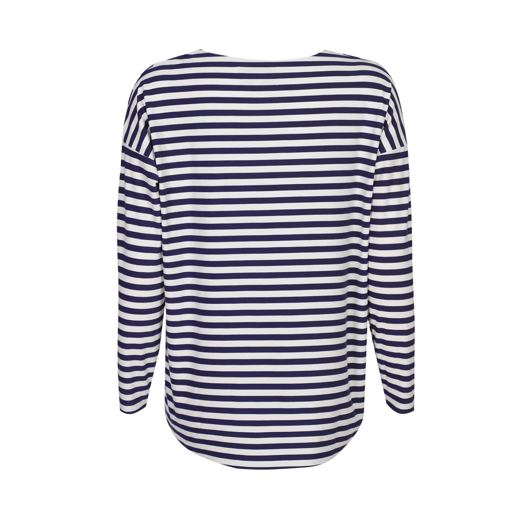 Langermet topp fra Liberte i den velkjente Alma-kvaliteten. Toppen har blå og hvite striper med rund hals og en løs passform.