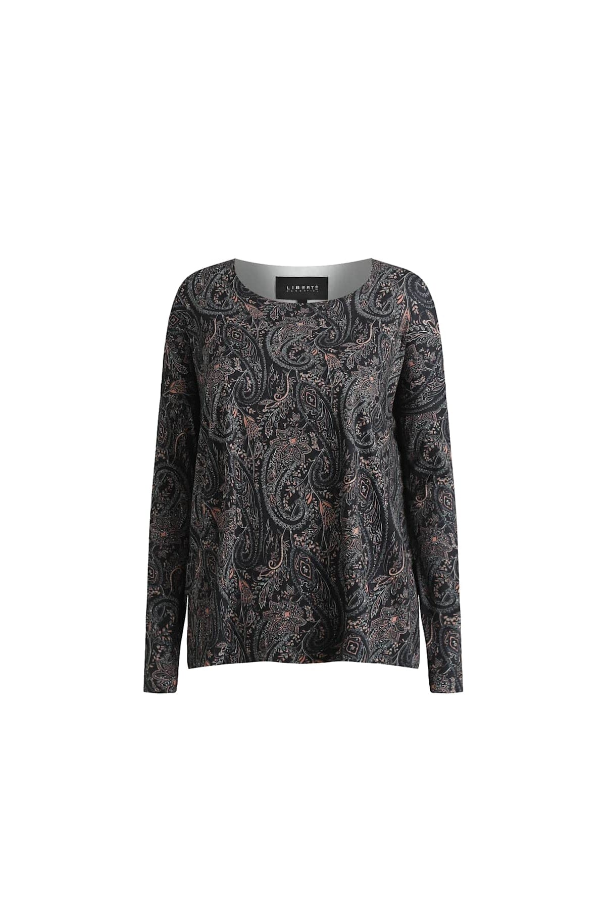 Topp fra Liberte med mørkeblått paisleymønster. Toppen har lange ermer og en rund halsutringning, og den passer både til hverdags og hjemme.