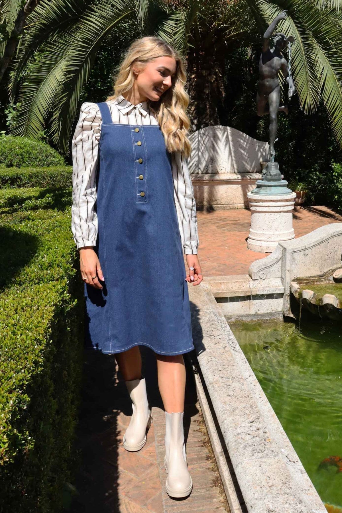 Denim-overall fra Liberte i klassisk blå. Den har brede stropper og knappelukking foran med dekorative sømmer langs kantene.
