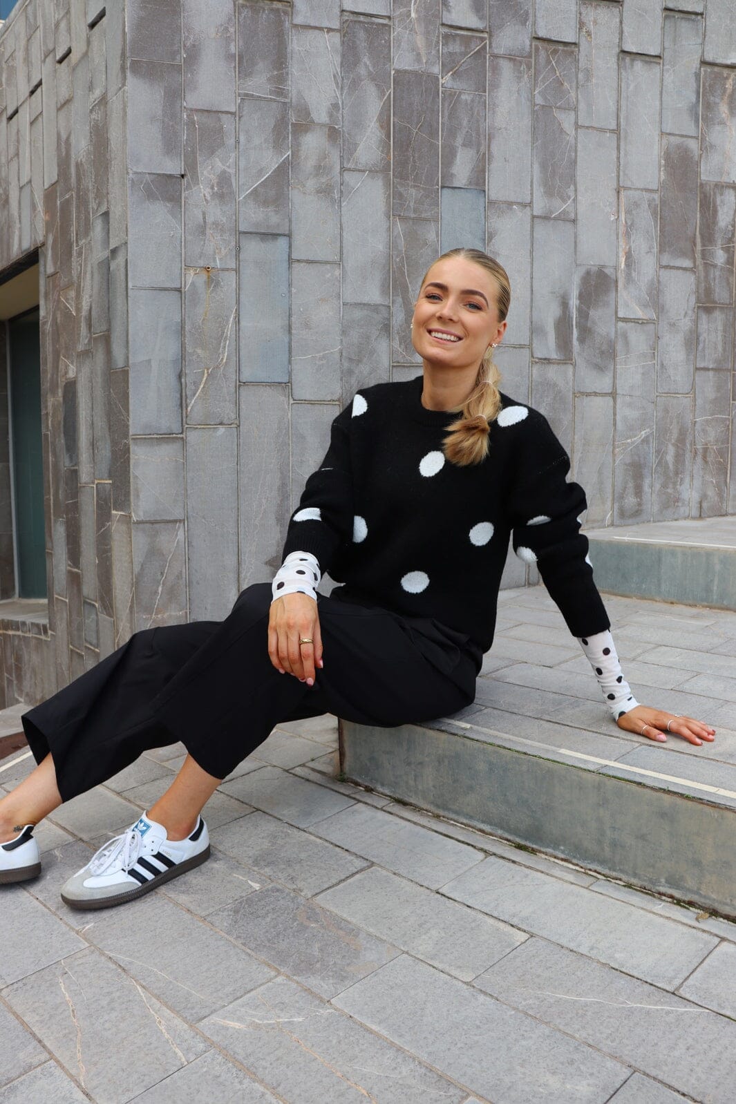 Svart pullover fra Liberte med hvite prikker. Pulloveren har en rund halsutskjæring, lange ermer og en løs passform.