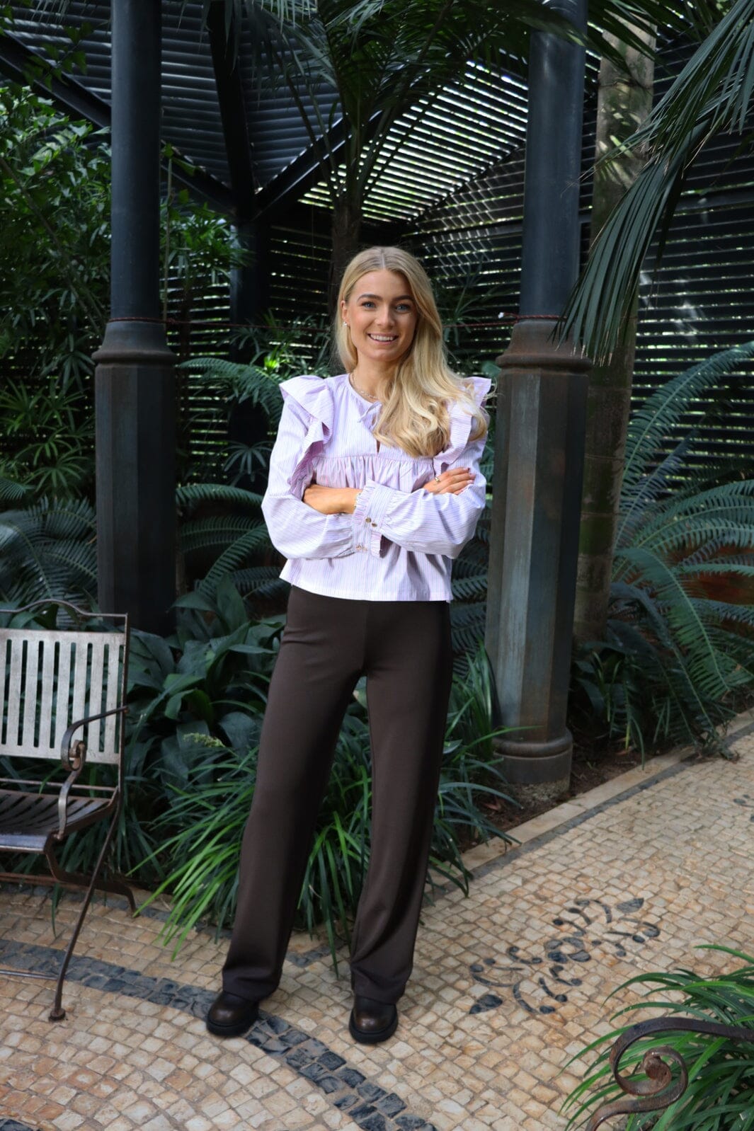 Rosa stripete bluse fra Liberte, laget av 100 % bomull. Blusen har et rosa og hvitt stripemønster med rynker på skuldrene.