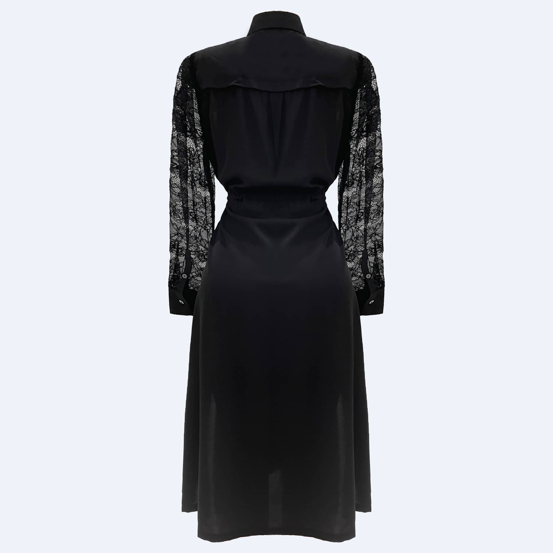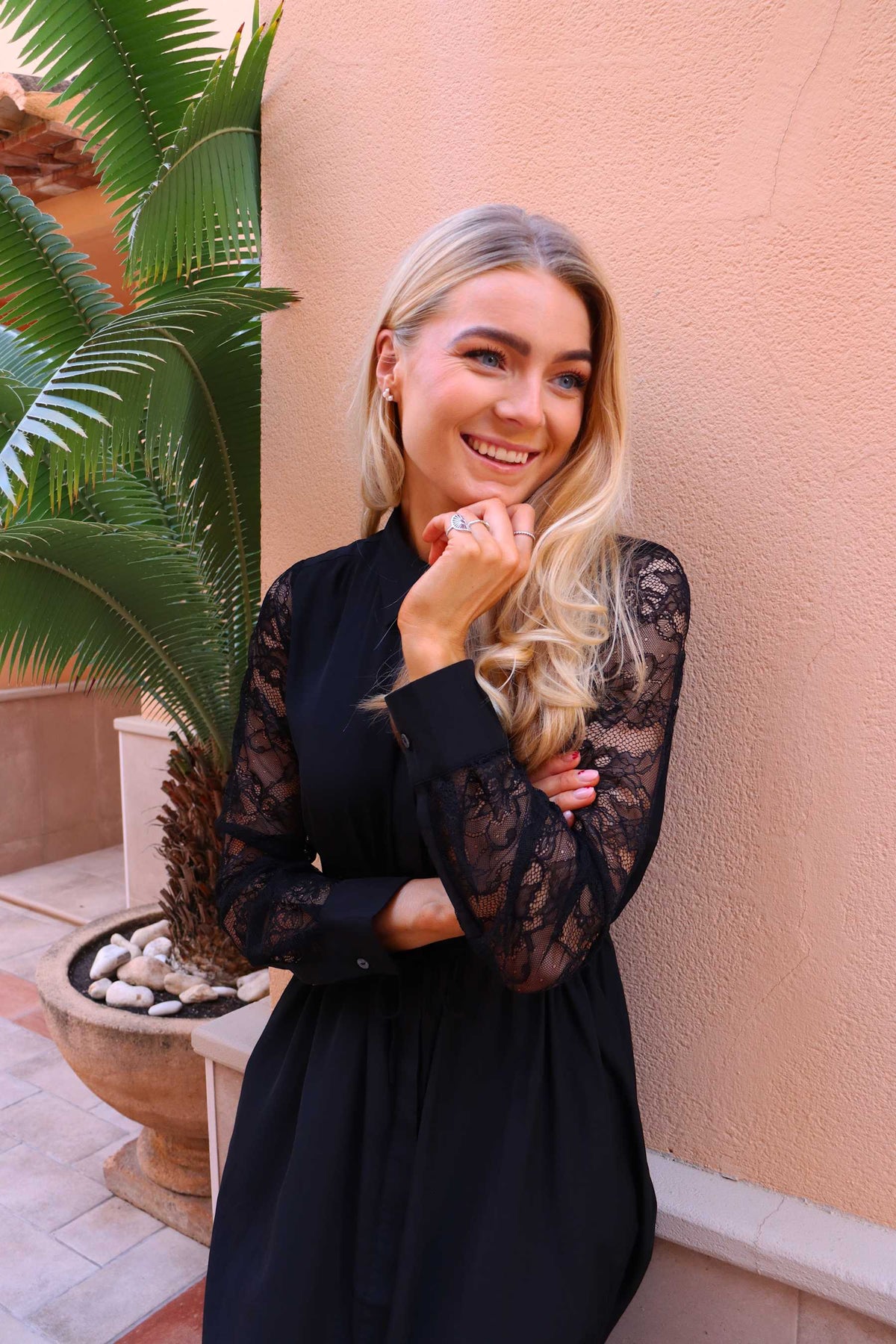 Sort lang skjorte fra Liberte med blondeermer og knytebånd i midjen. Skjorten passer til både hverdagsbruk og festlige anledninger.