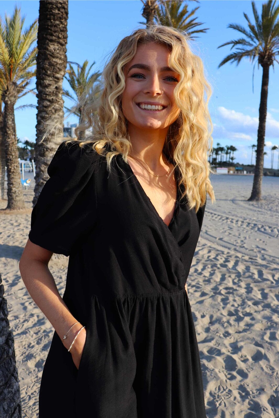 Svart kjole fra Liberte med V-halsutskjæring og puffede ermer. Kjolen har en myk kvalitet og en løs passform som gir god bevegelsesfrihet.