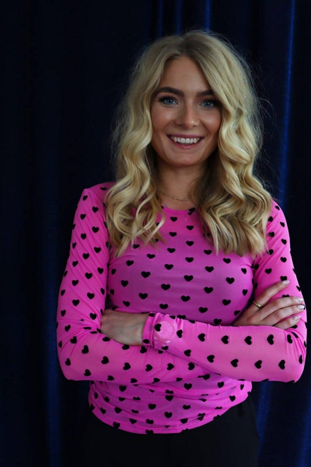Rosa langermet mesh-t-skjorte fra Liberte med svarte hjerter over hele overflaten. T-skjorten har en slim fit-passform og rund hals.