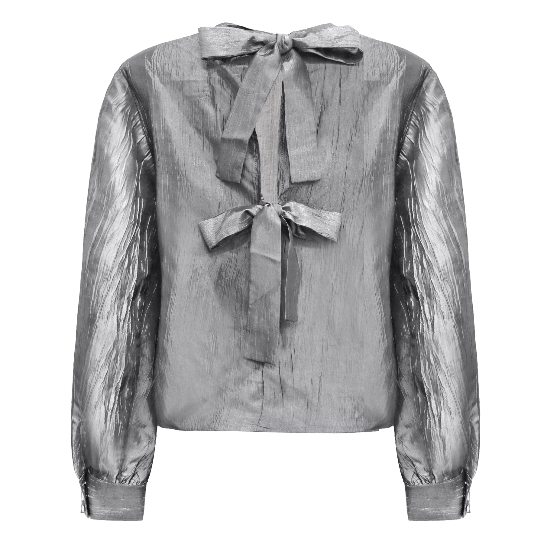 Sølvgrå bluse fra Liberte med glinsende overflate. Blusen har høy hals med bindebånd og lange ermer med knapper ved håndleddene.