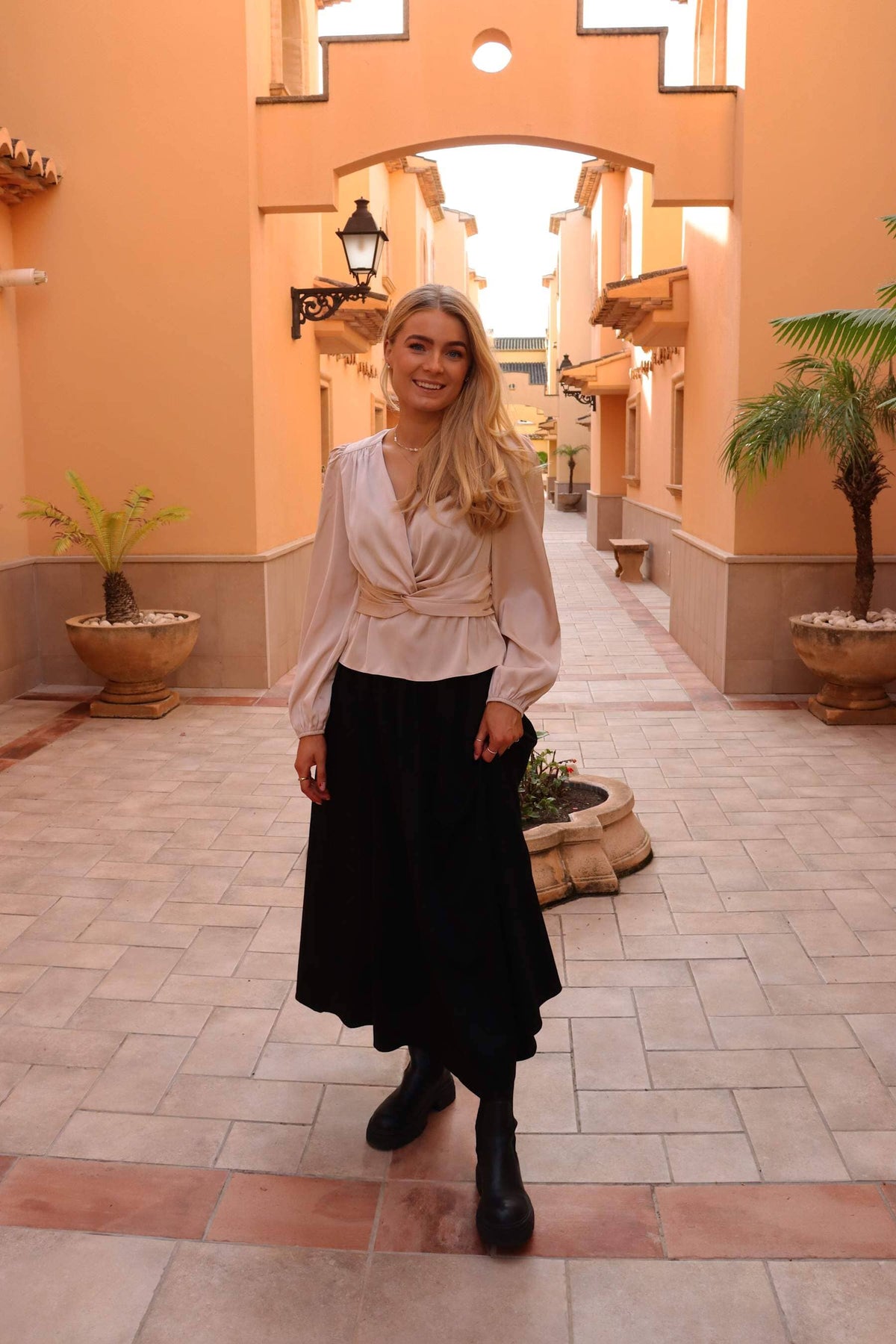 En bluse fra Liberte i en lys beige champagnefarge, laget av 100 % polyester. Blusen har twist-detalj foran og en rynket seksjon bak.
