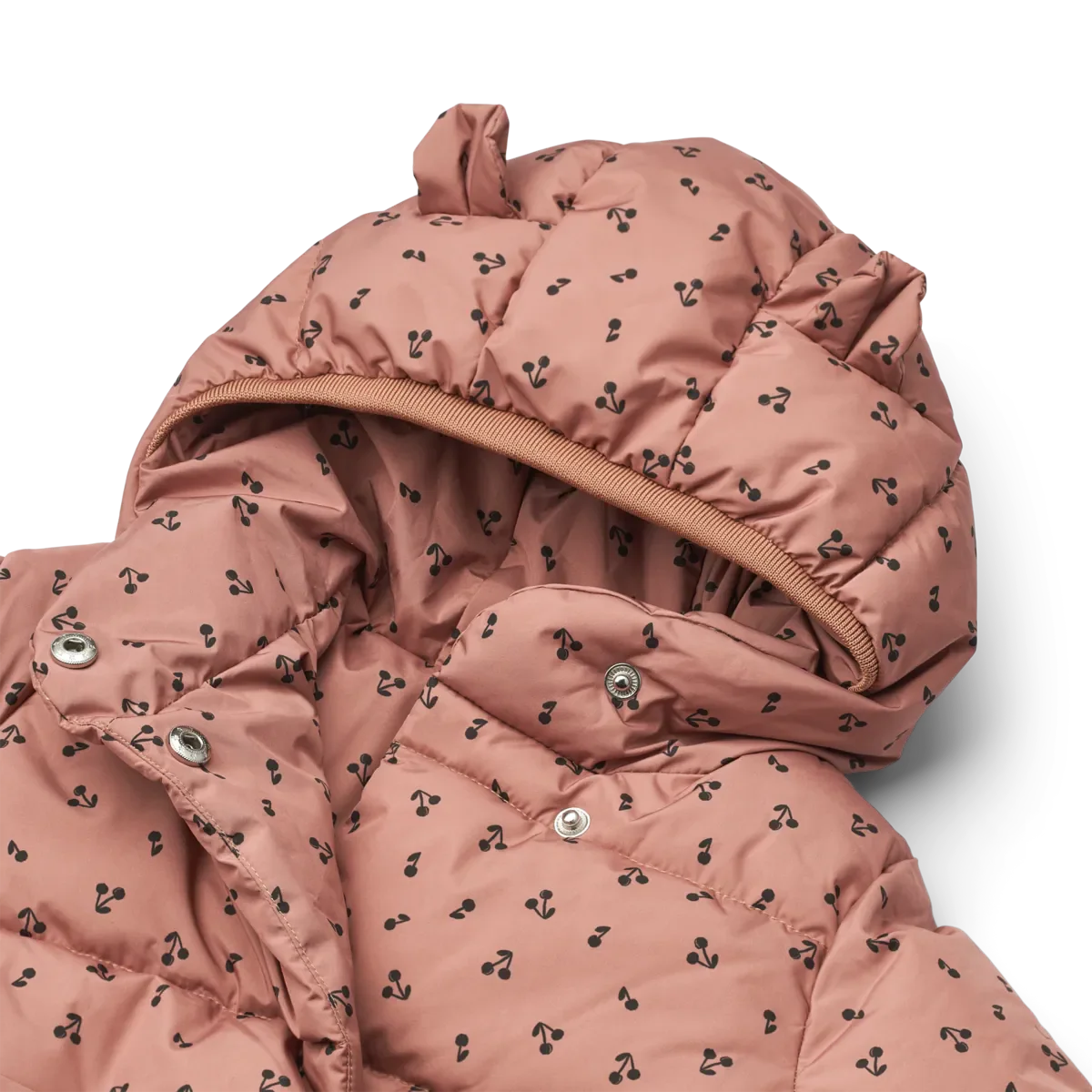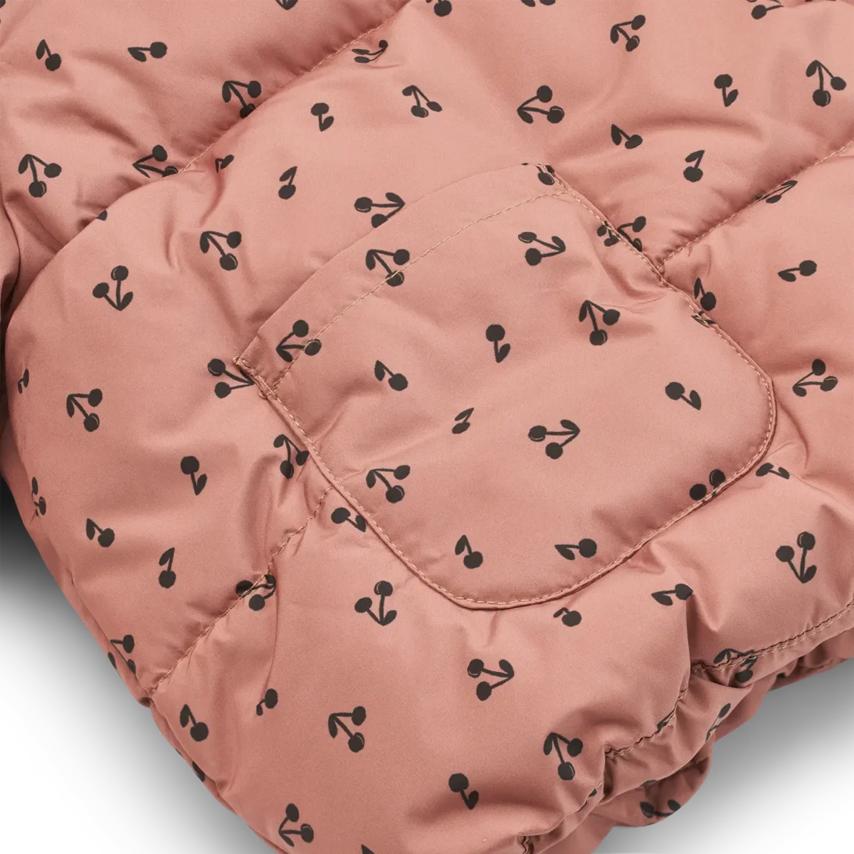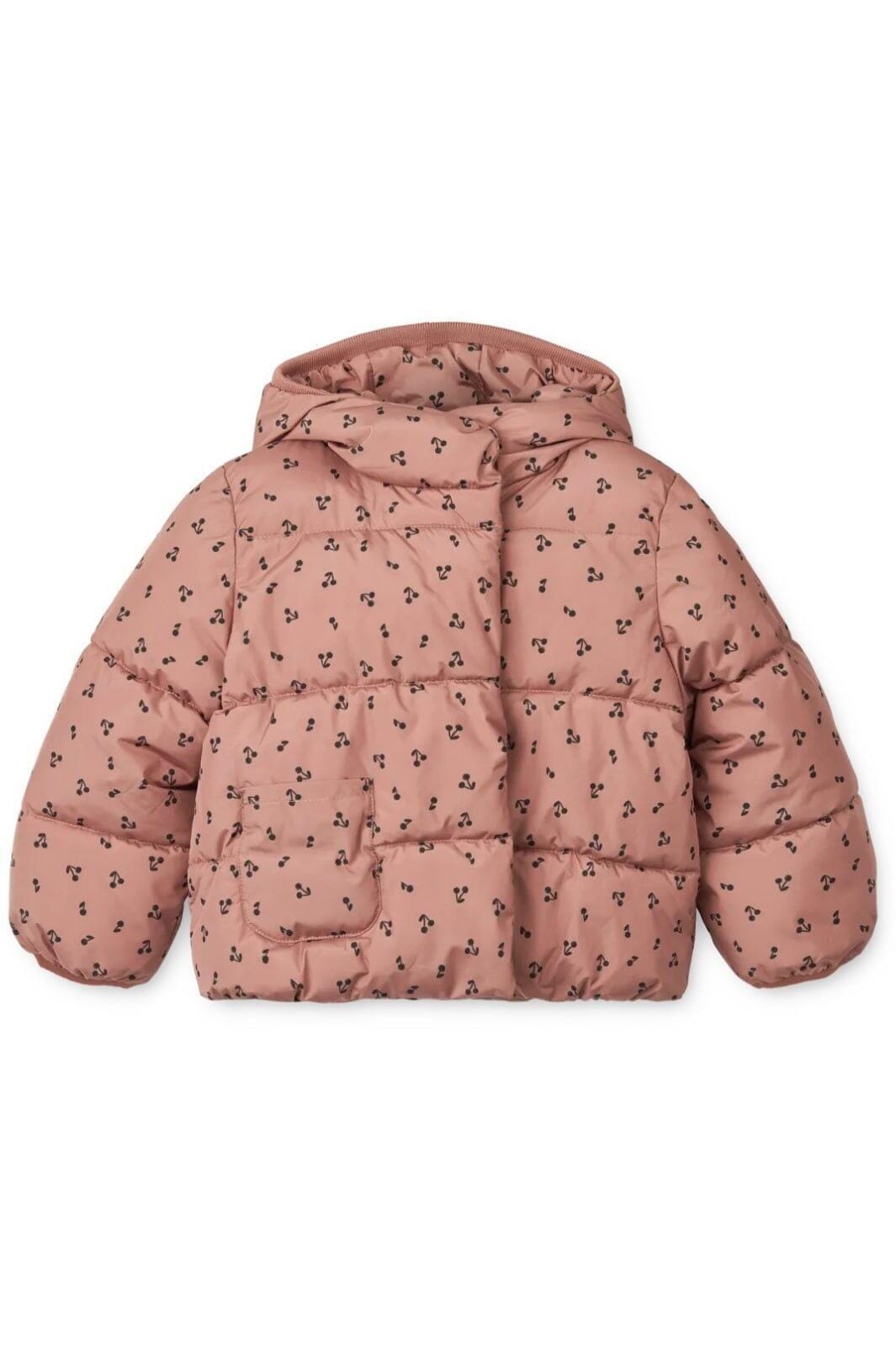 Quiltet jakke fra Liewood i rosa med kirsebærmønster. Jakken har en hette med ører, skjult trykknapplukking og en avrundet lomme på forsiden.