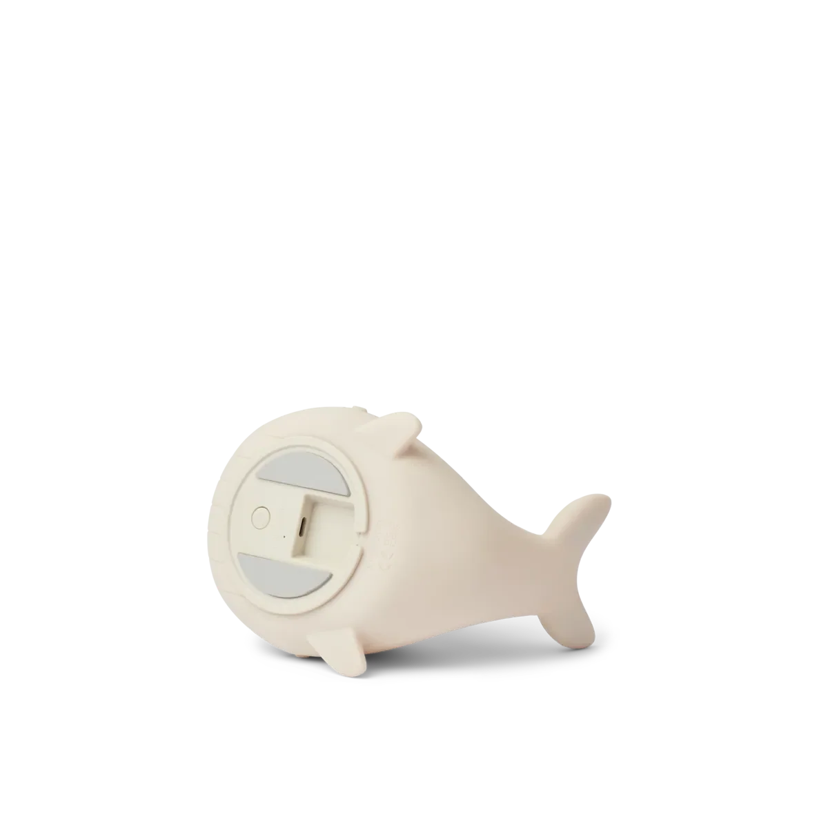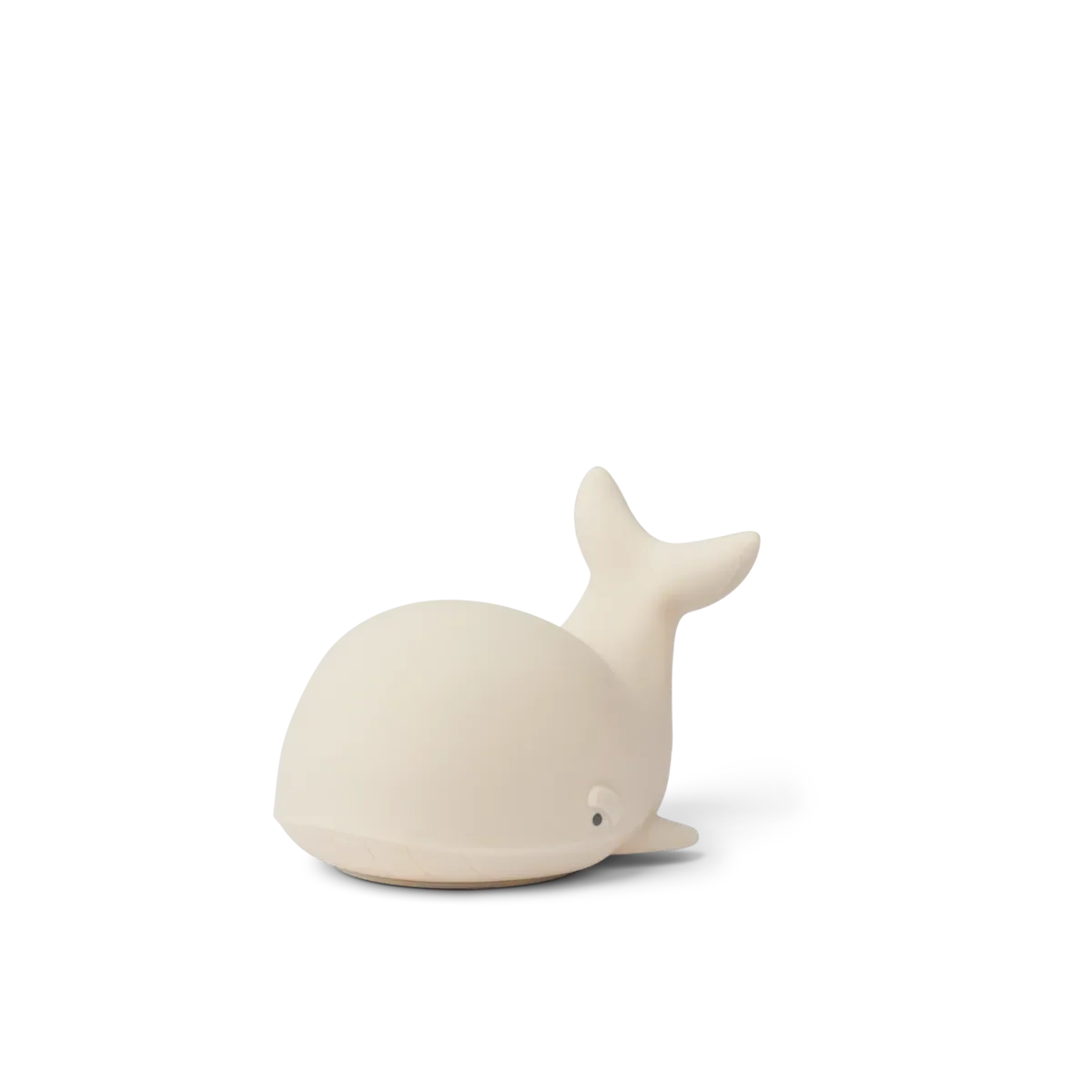 Hvalformet nattlampe i sandfarge fra Liewood. Laget av myk silikon med praktisk USB-C-lading og 12 timers batterilevetid på en enkelt lading.