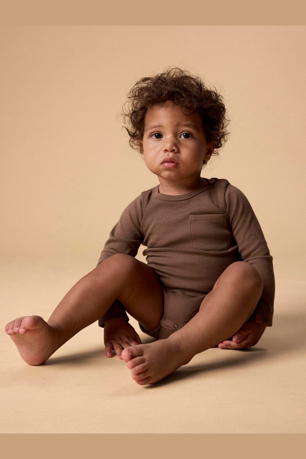 En brun body fra Lil' Atelier laget av en blanding av økologisk bomull og lyocell. Bodyen har en slim fit-passform og lange ermer.