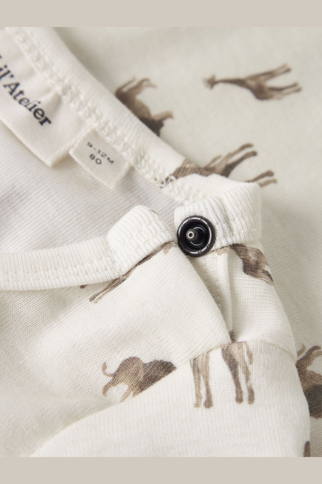 Langermet body fra Lil' Atelier i kremfarge med dyreprint av sjiraffer og løver. Bodyen har en slim fit og er laget av 57 % økologisk bomull, 38 % lyocell og 5 % elastan.