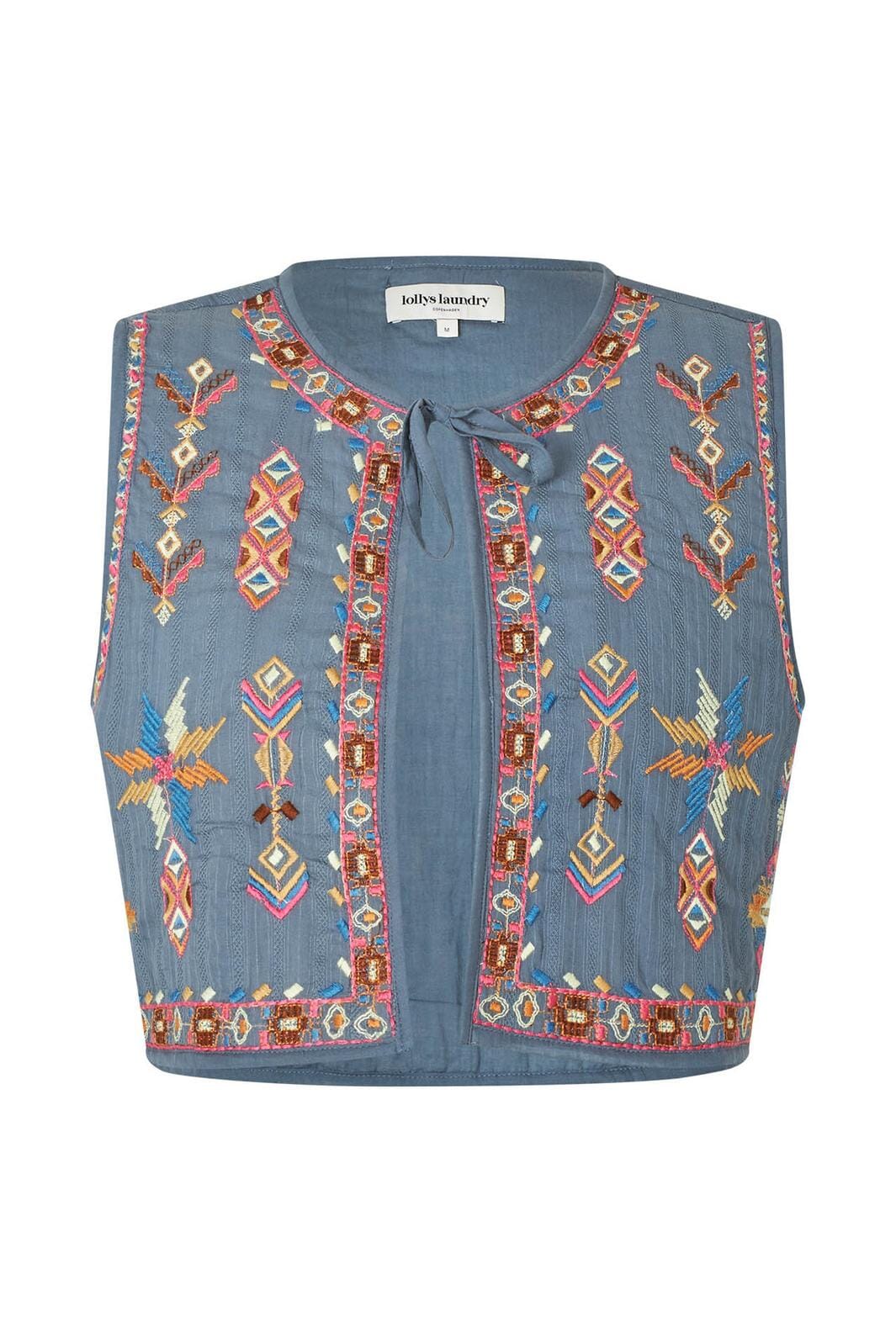 Støvet blå vest fra Lollys Laundry med fargerikt broderi. Vesten har en rund hals med knytebånd og er fremstilt i bomull med detaljerte mønstre langs kantene.