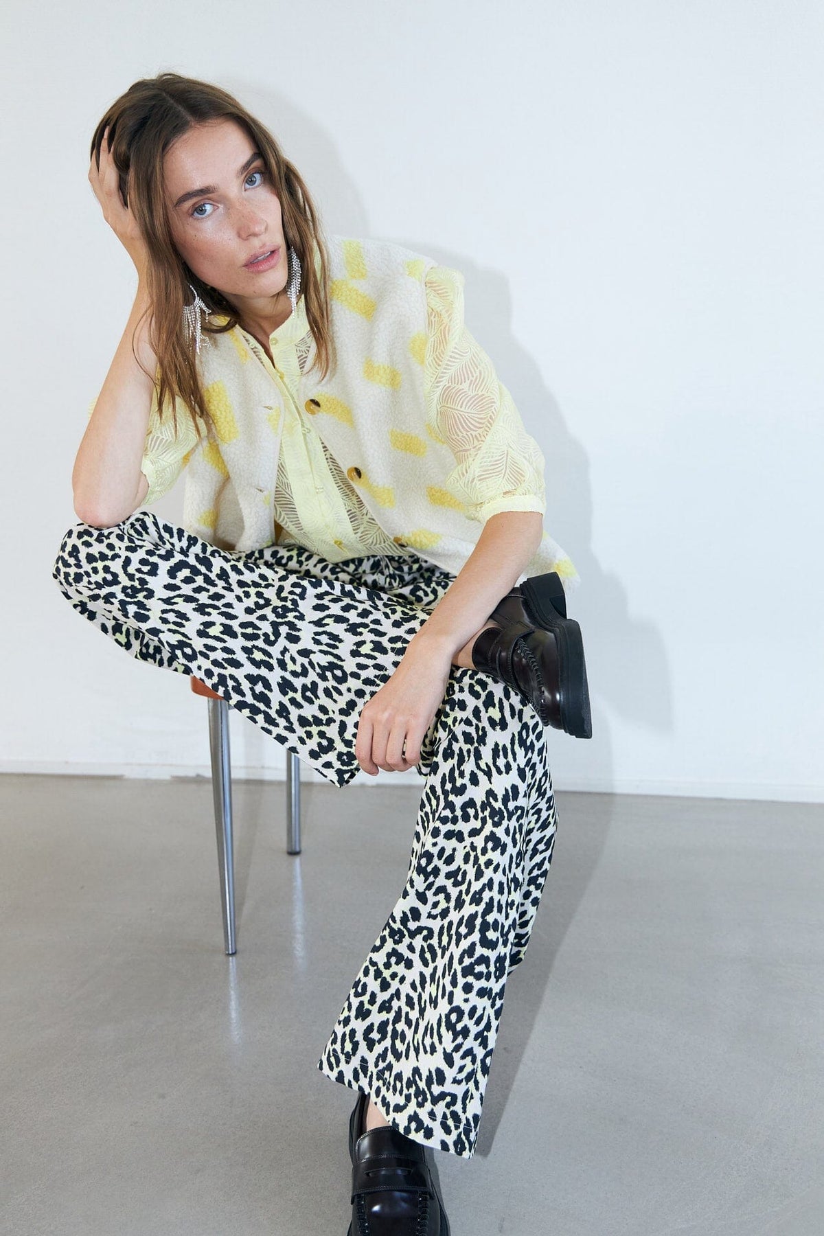 Ermeløs vest fra Lollys Laundry med et geometrisk mønster av gule rektangler på krembakgrunn. Den har rund halsutskjæring og knapper foran.