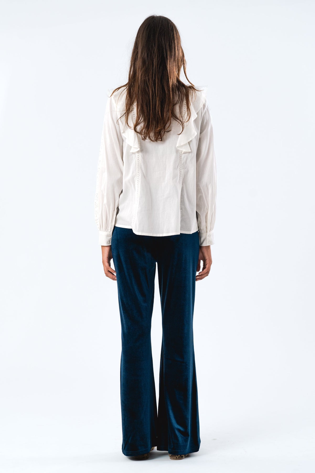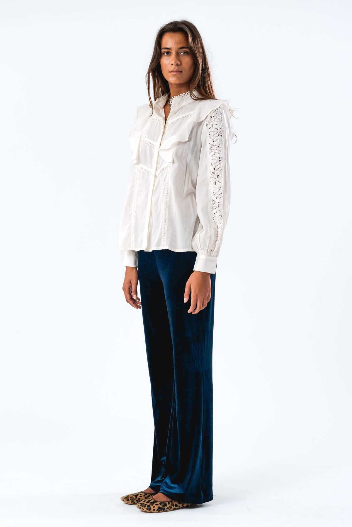 Cremehvit skjorte fra Lollys Laundry med høy krage og lange ermer. Skjorten har broderi og volanger på forsiden samt blondeinnsatser på ermene.