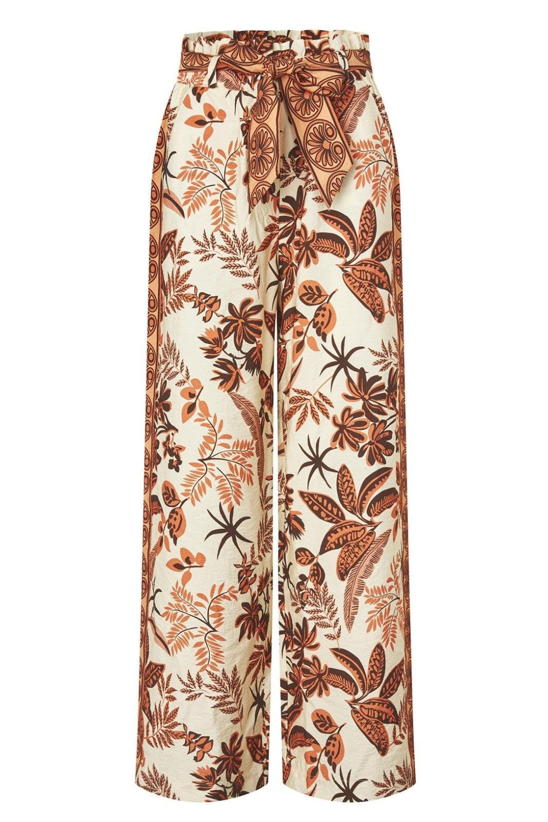 Kremfargede bukser fra Lollys Laundry med en miks av blomster, paisley og prikker. Buksene har et lett og luftig design med et dekorativt mønster på en lys bakgrunn.