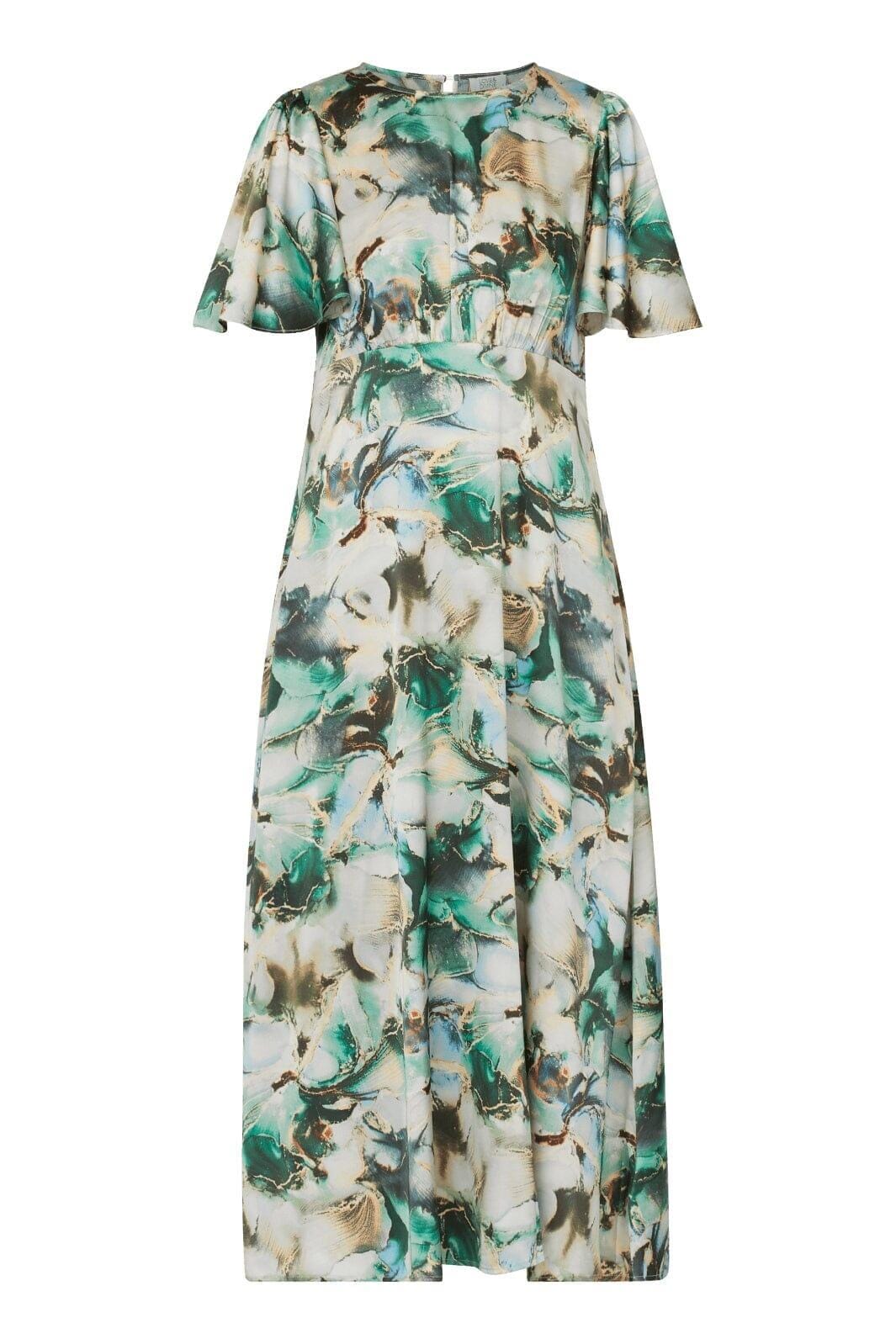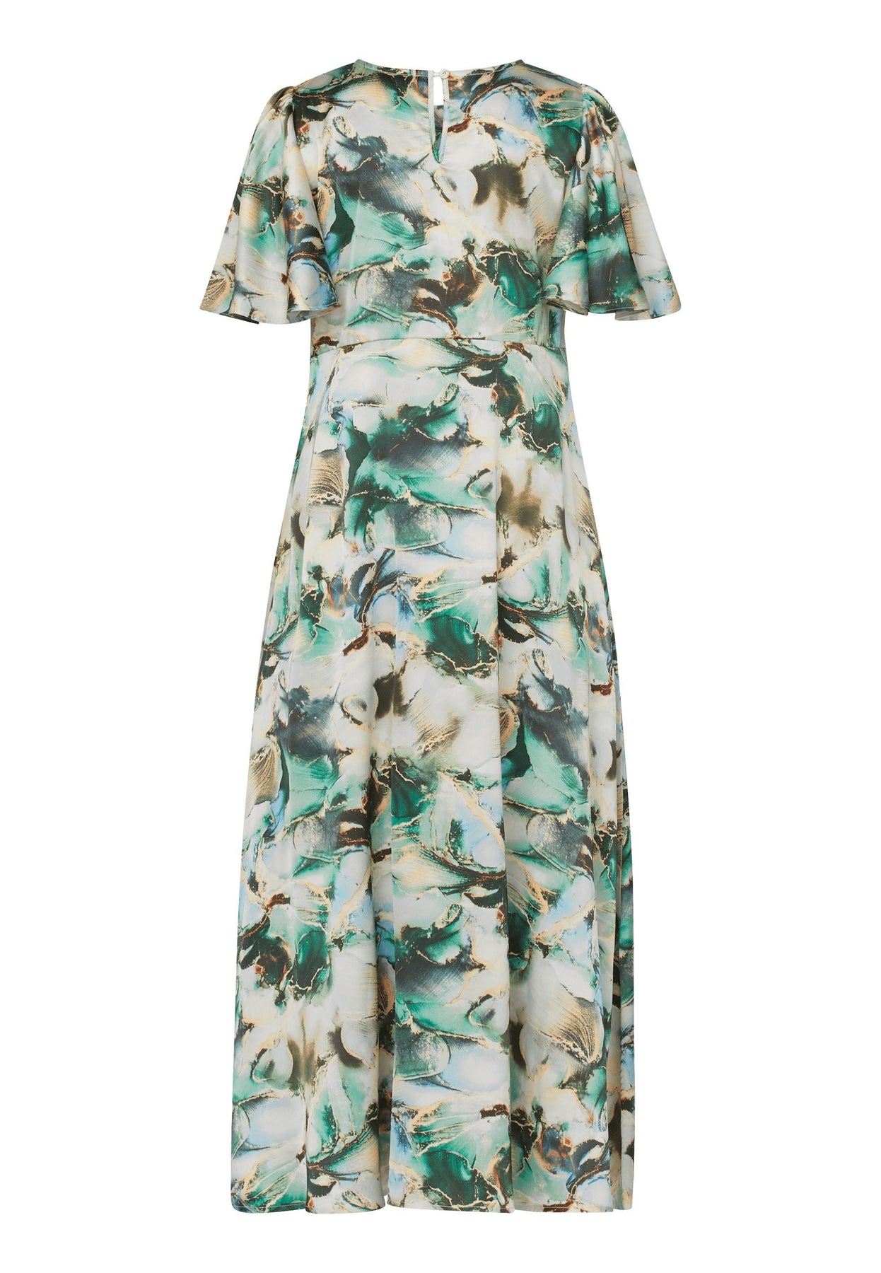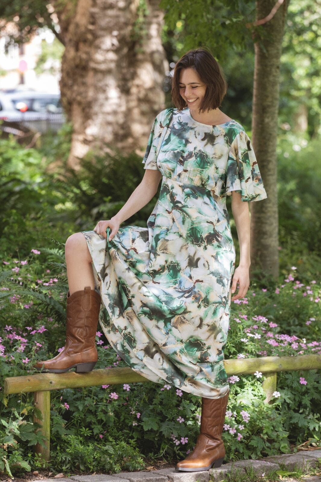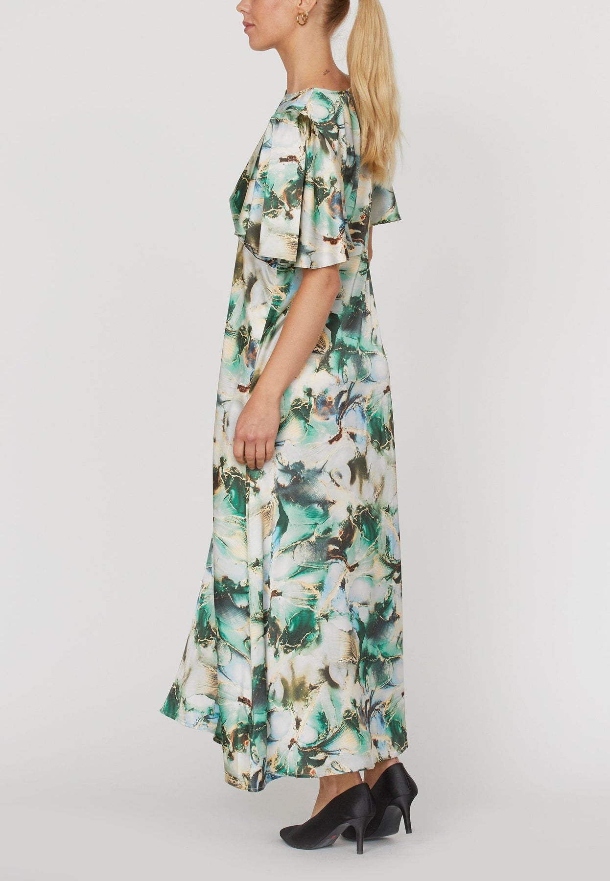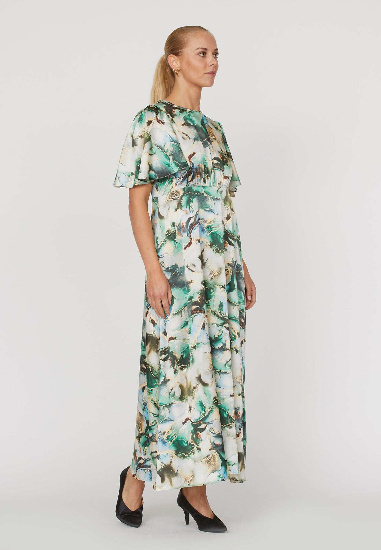er en lang kjole med et marmorlignende mønster. Kjolen har en feminin skjæring under brystet, en rund hals og korte løse ermer. Modellen har på seg en størrelse S.