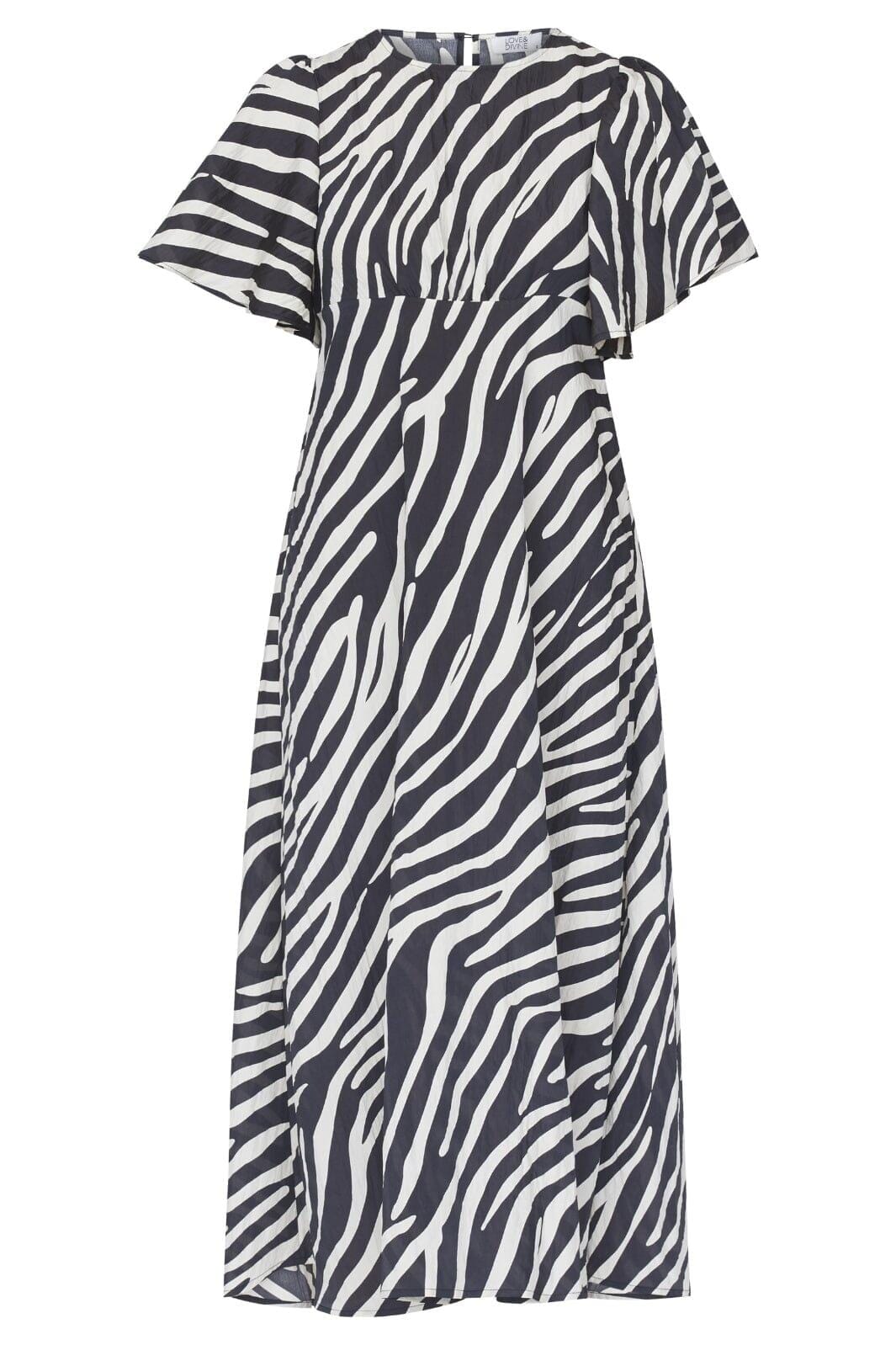 Lang kjole fra Love & Divine med svart og hvitt zebramønster. Kjolen har en skjæring under brystet og en løs passform som gir plass til bevegelse.