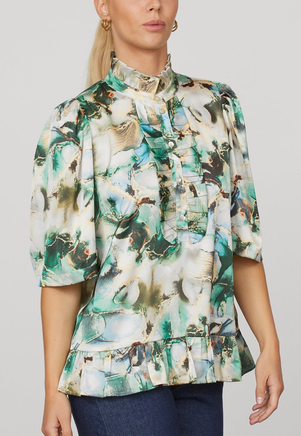Kort bluse fra Love & Divine med et marmorert mønster i grønne og hvite nyanser. Blusen har høy hals med volanger, 3/4-ermer og knapper foran.