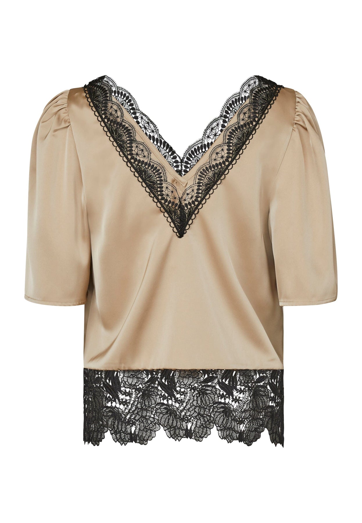 er en topp i skinnende satinkvalitet med blonde detaljer ved hoften, og ved den dype V-utringningen ved brystet og ryggen. Modellen er 173 cm høy og har på seg størrelse S.