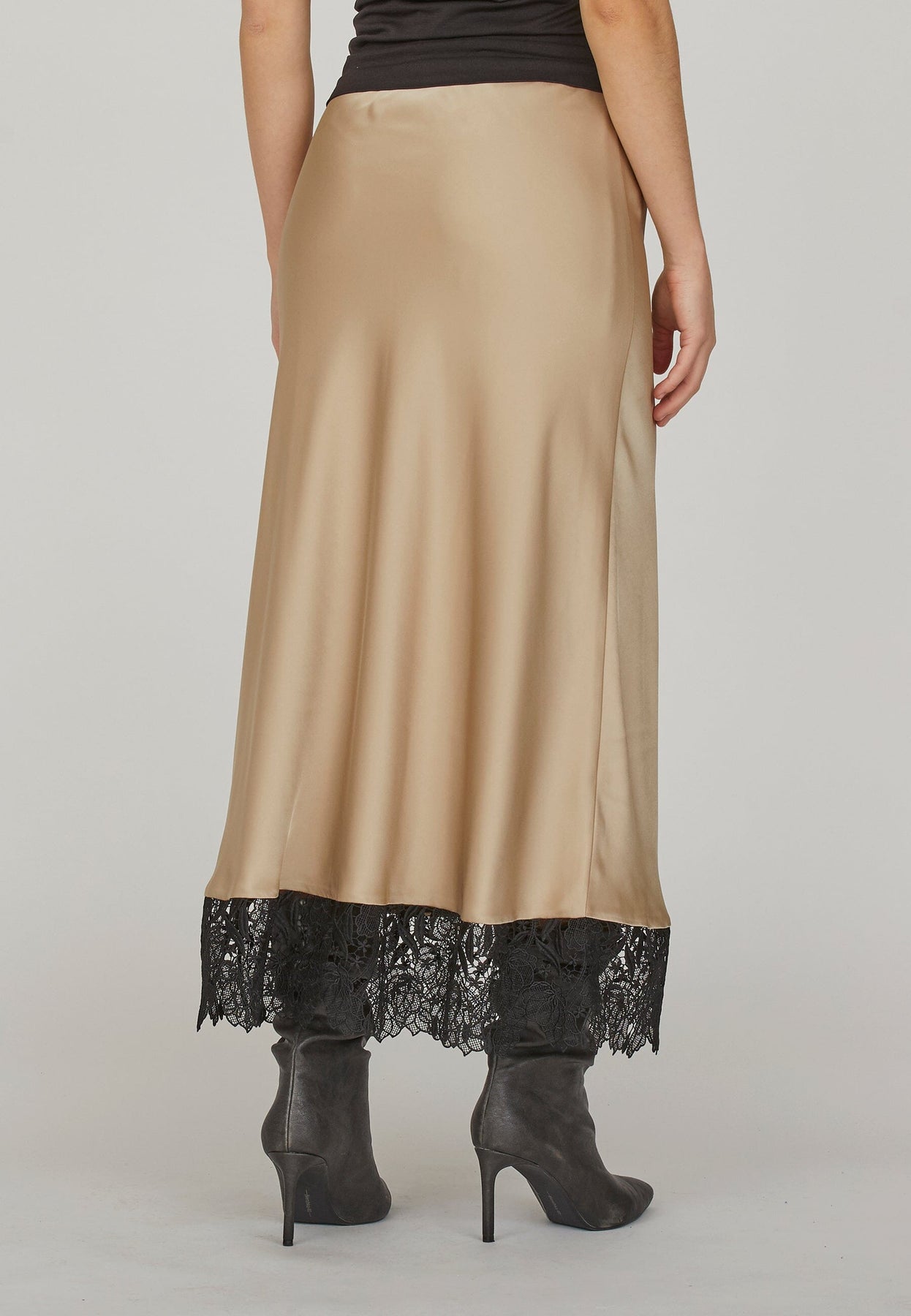 er en lang skjørt i skinnende satinkvalitet. Skjørtet har en bred blondekant nederst. Modellen er 173 cm høy og har på seg størrelse S.