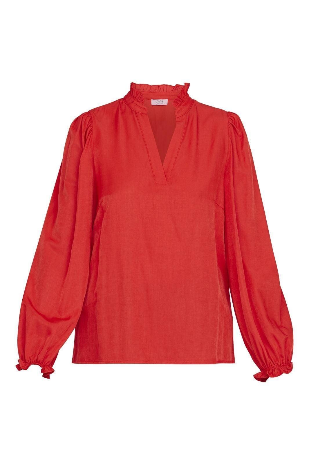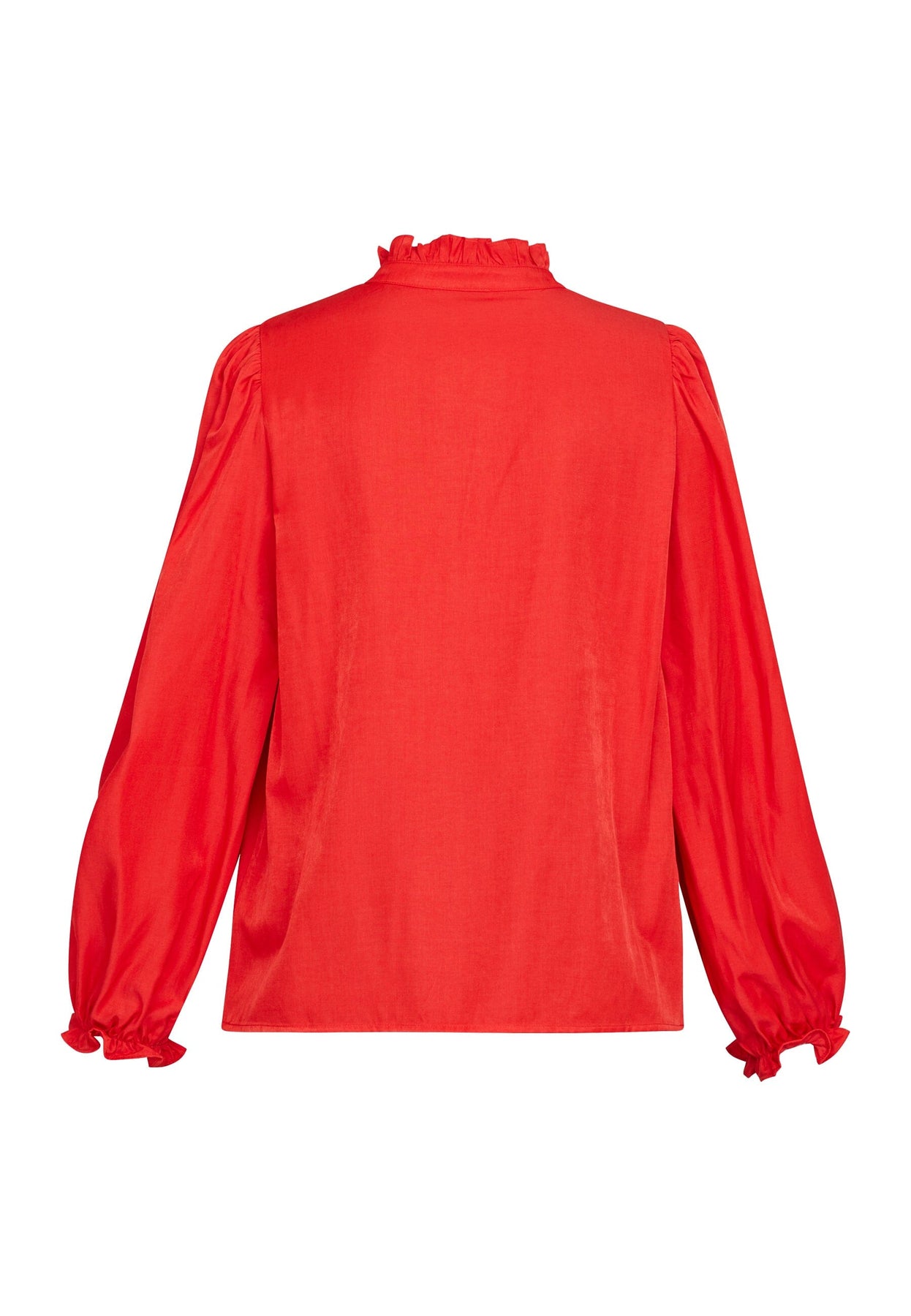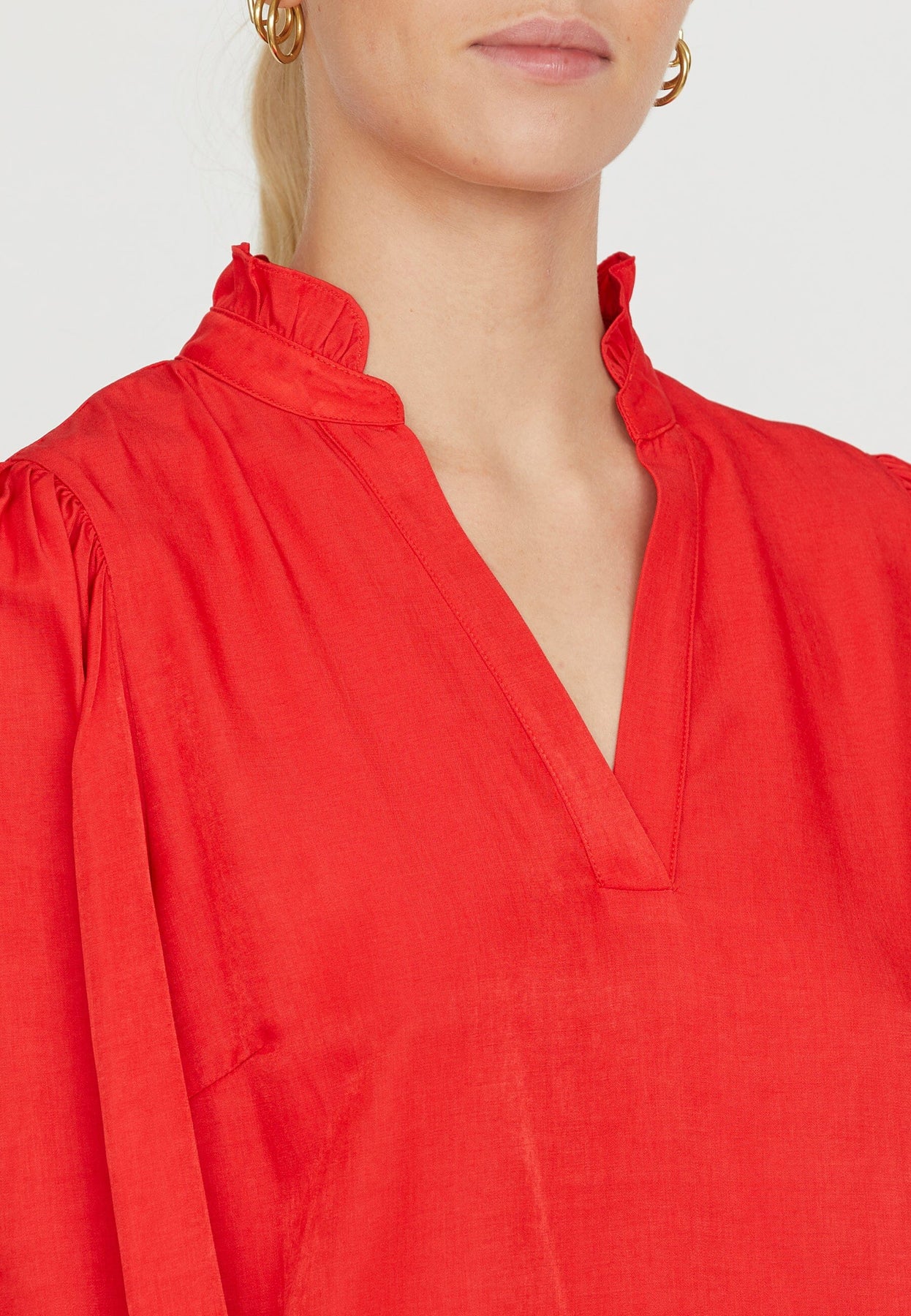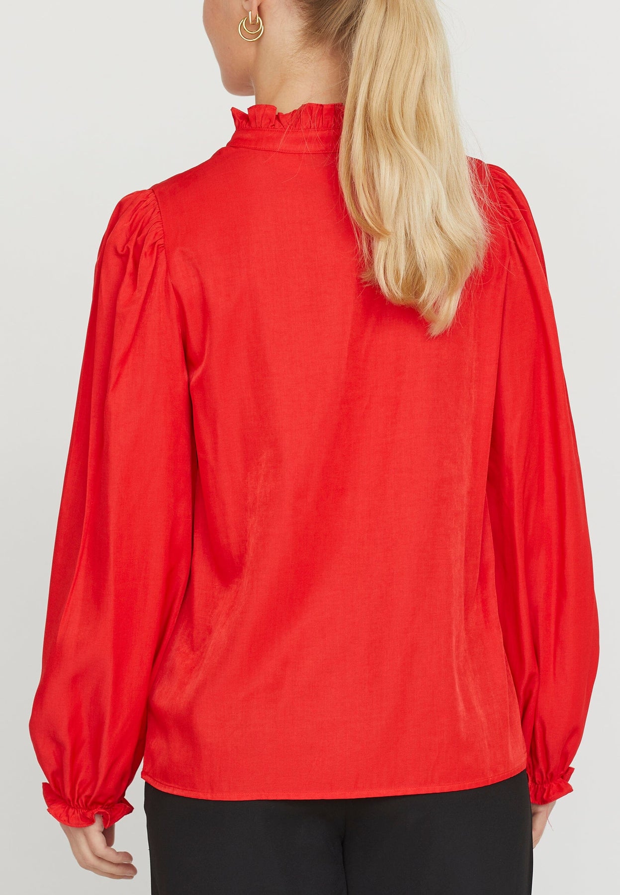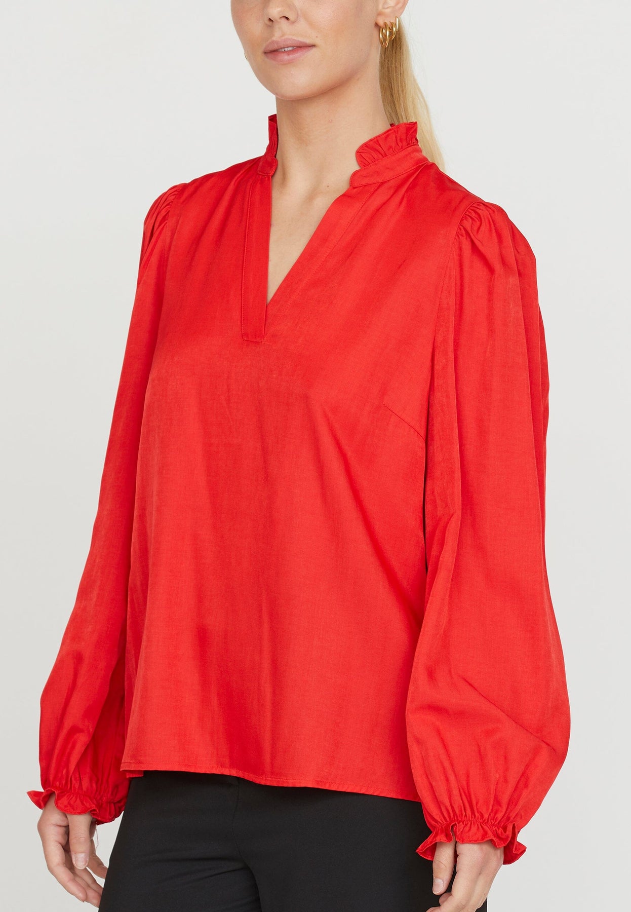 Rød bluse fra Love & Divine med rynket krage og pufferm. Blusen har en v-halsutskjæring og volangdetaljer ved skuldrene som skaper et feminint uttrykk.