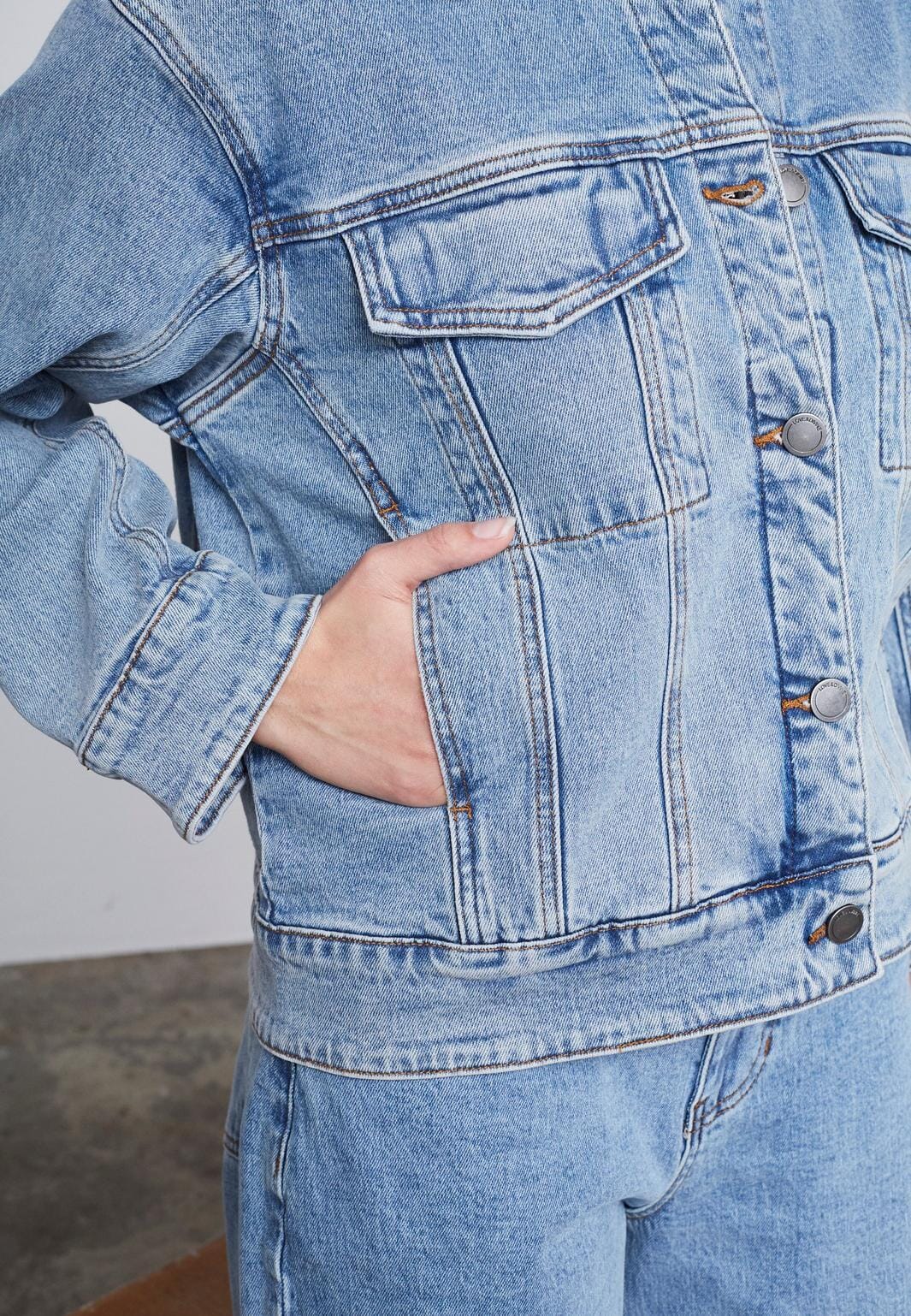 Lys denimjakke med skjortekrage og synlige sømmer. Den klassiske knappelukningen og de påsydd lommene gir jakken et autentisk denimuttrykk.