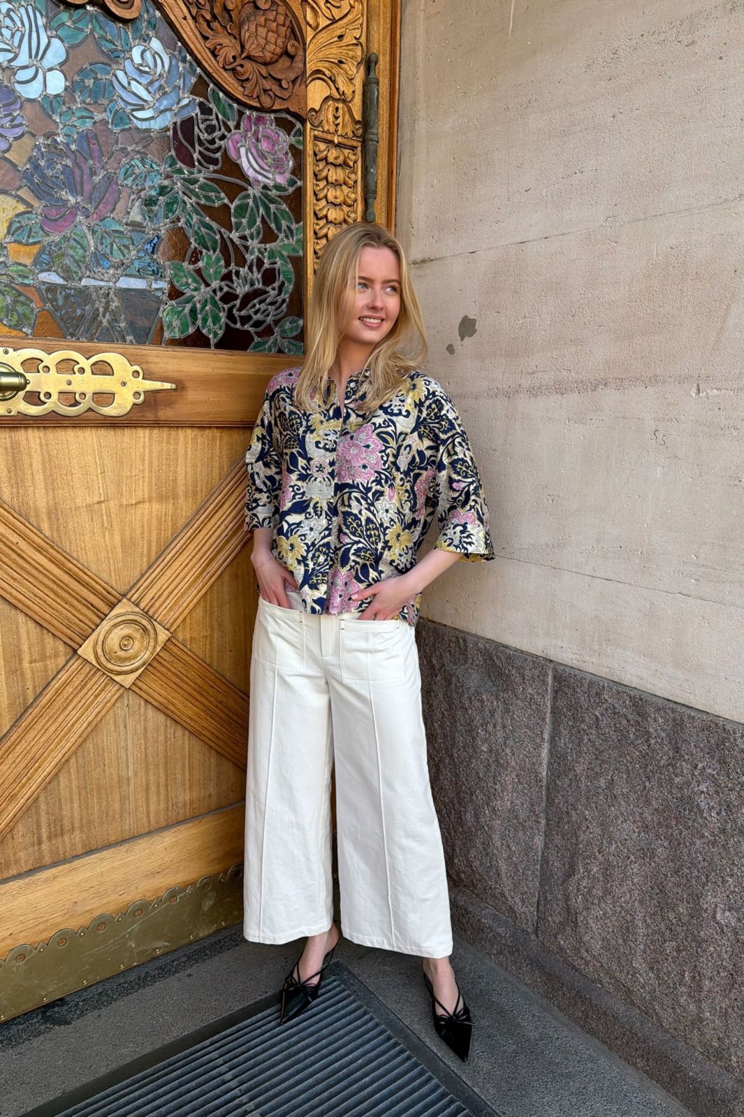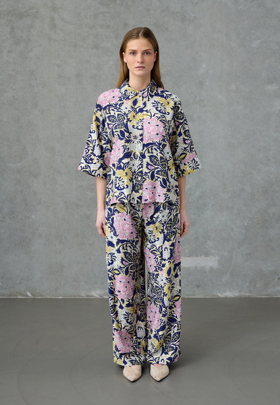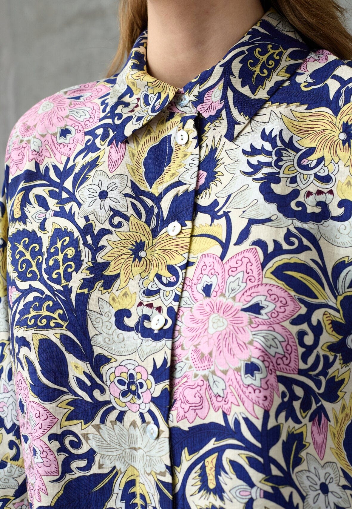 Skjorte fra Love & Divine i mørkeblå og blå nyanser med paisley- og blomsterprint. Skjorten har en oversized passform, trekvartsermer og klassisk krage med knappelukking.