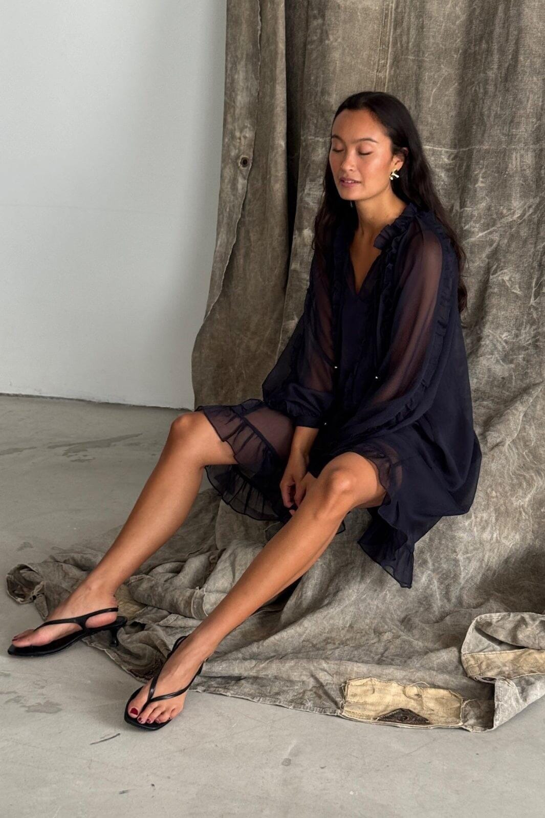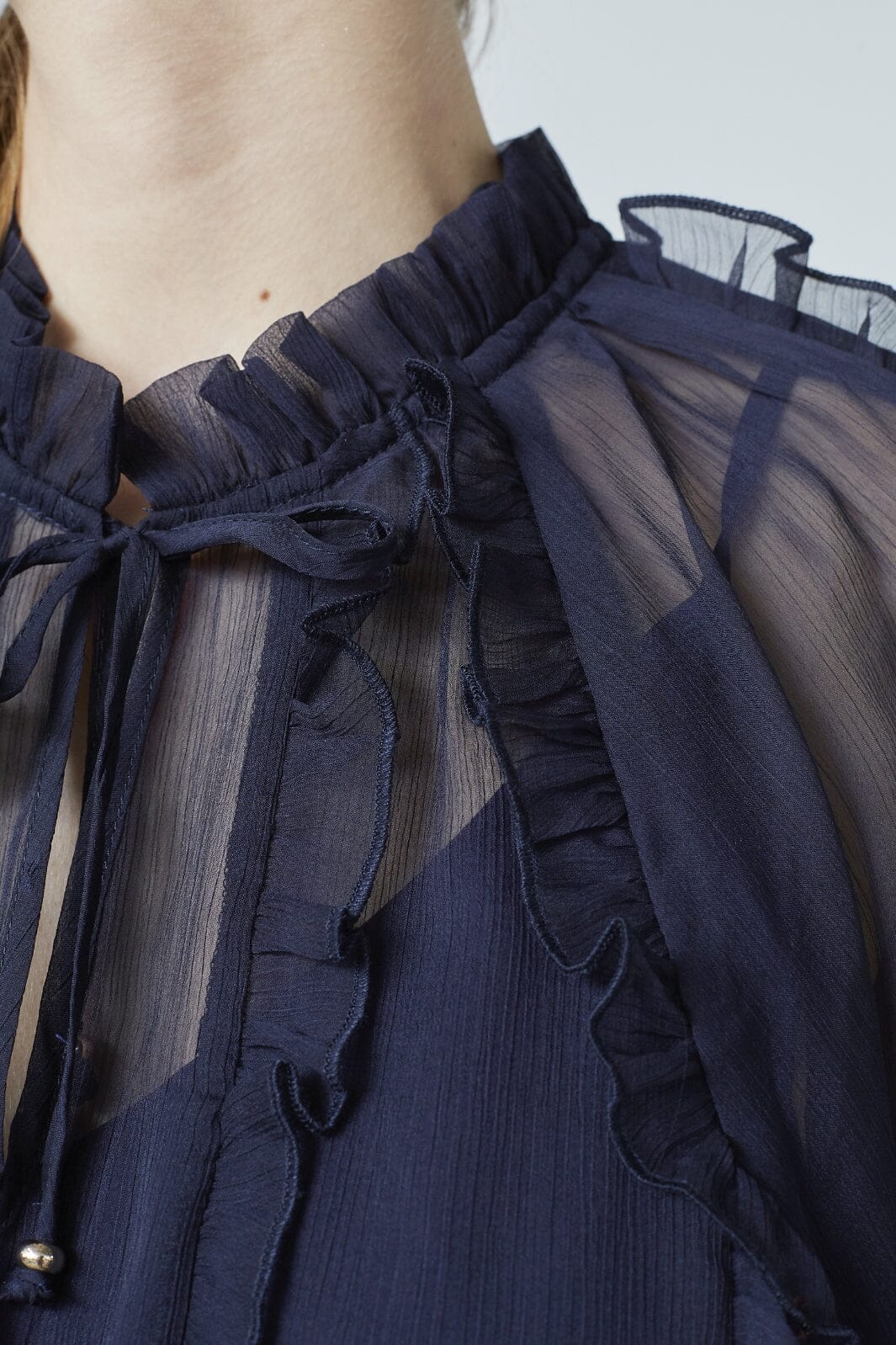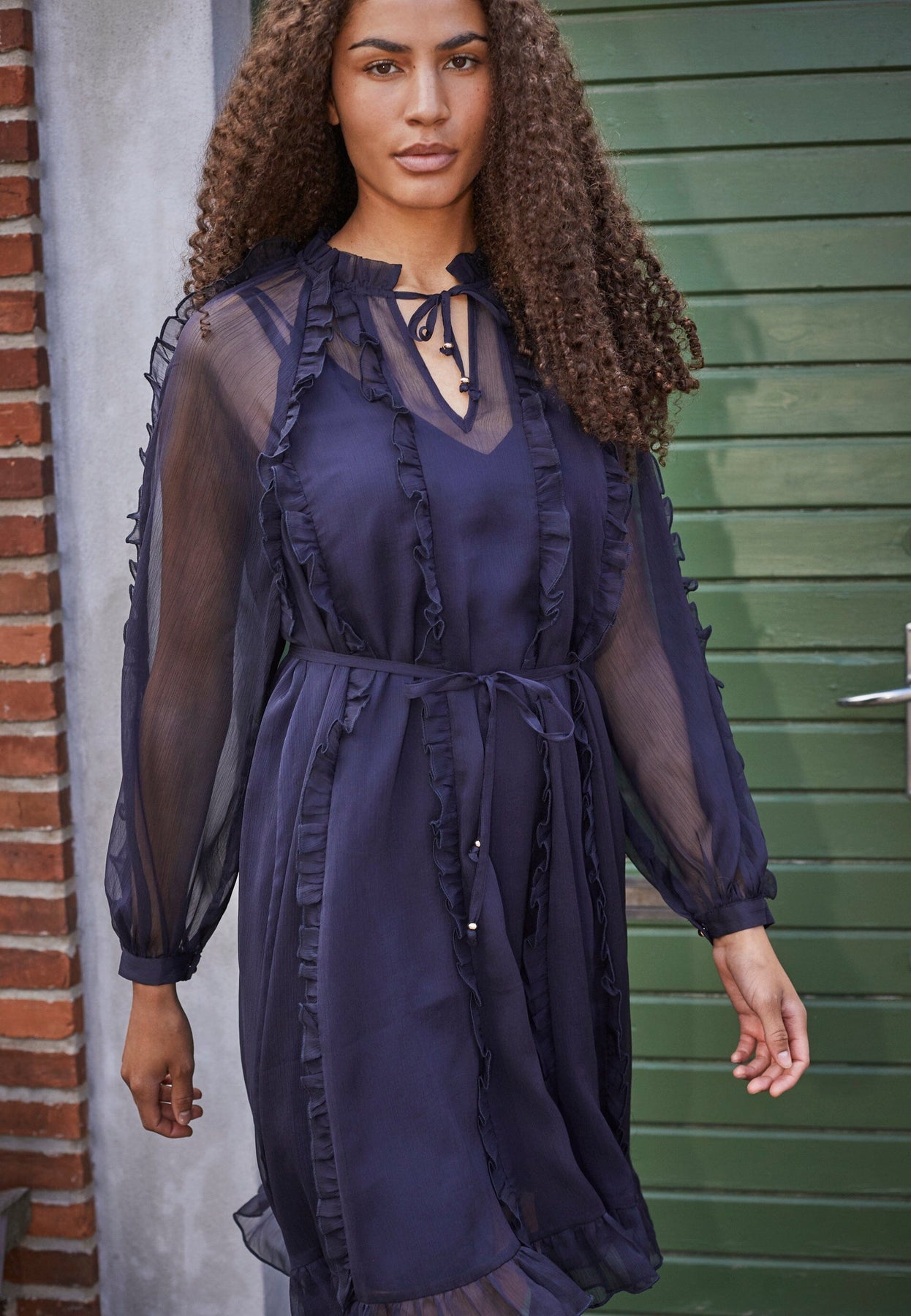Navy kjole fra Love & Divine med volangdetaljer. Kjolen har høy hals med bindebånd, lange ermer og et lett transparent stoff med volanger langs fronten og ermene.