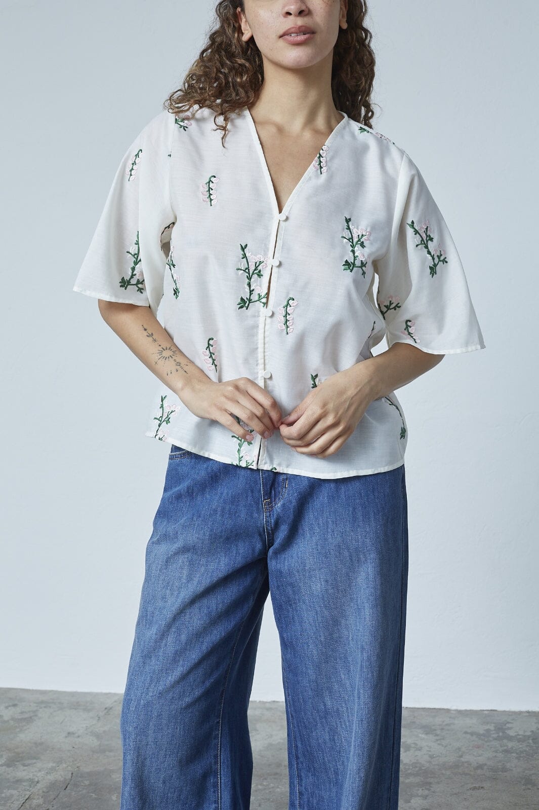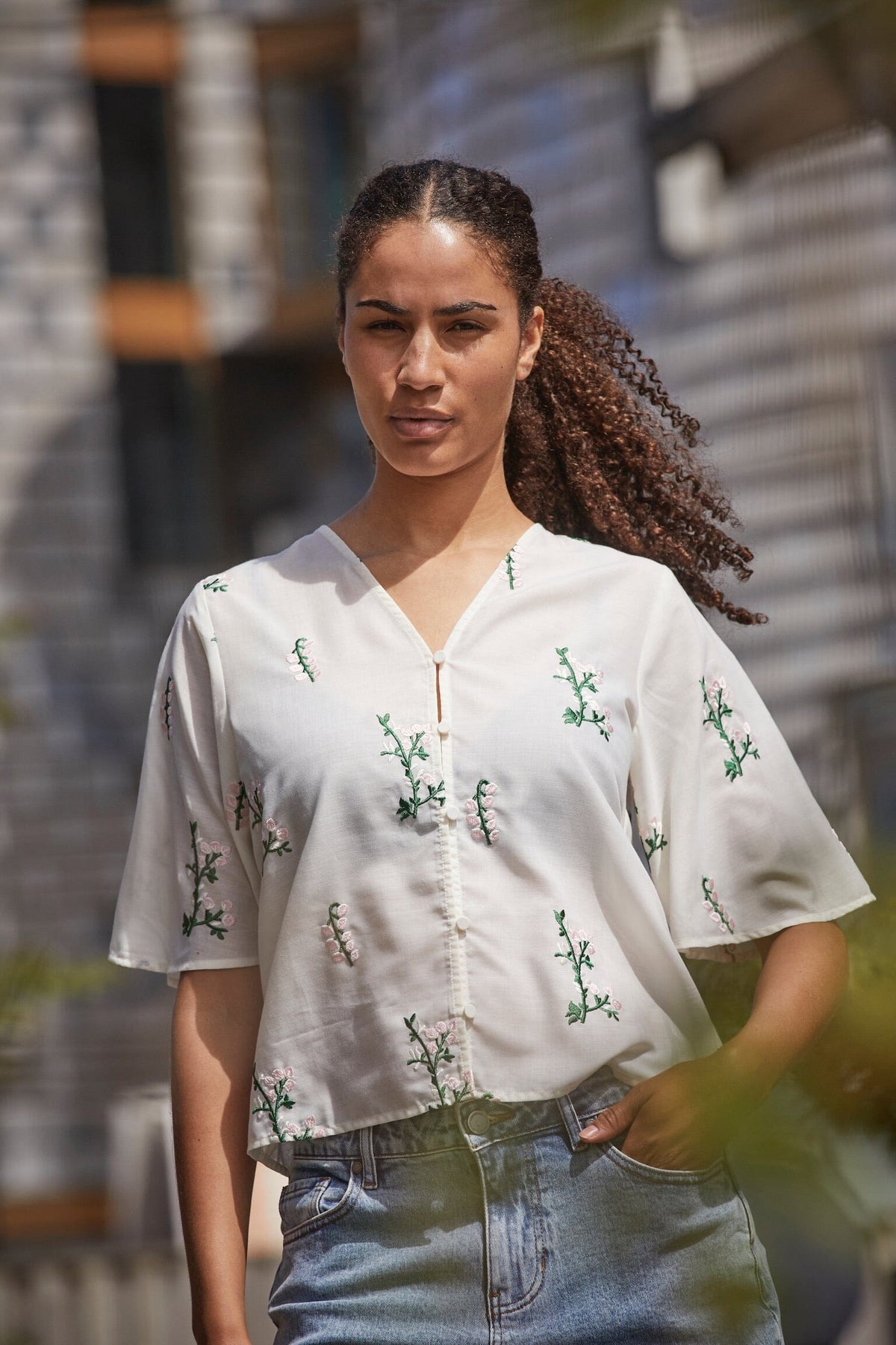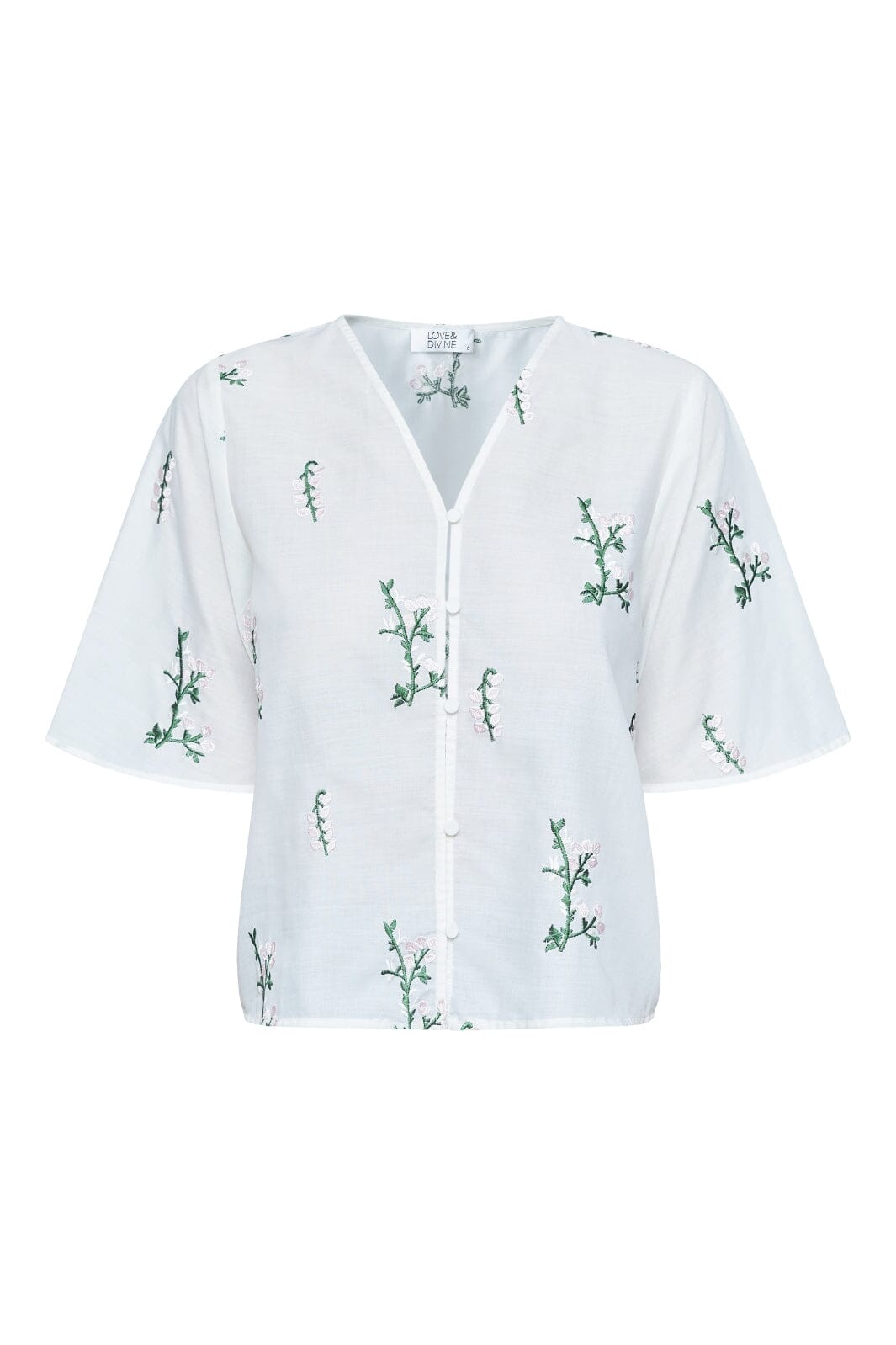 Kremfarget bluse fra Love & Divine med broderte blomster i rosa og grønne stilker. Blusen har en v-halsutskjæring, knappelukking foran og brede, korte ermer.