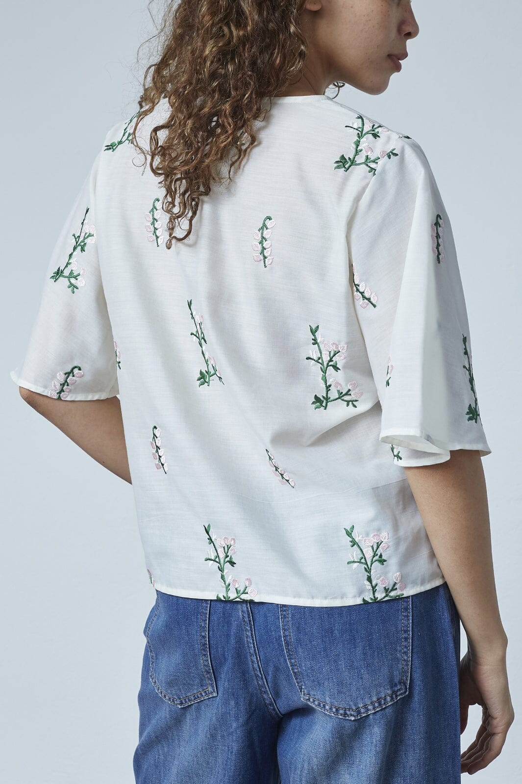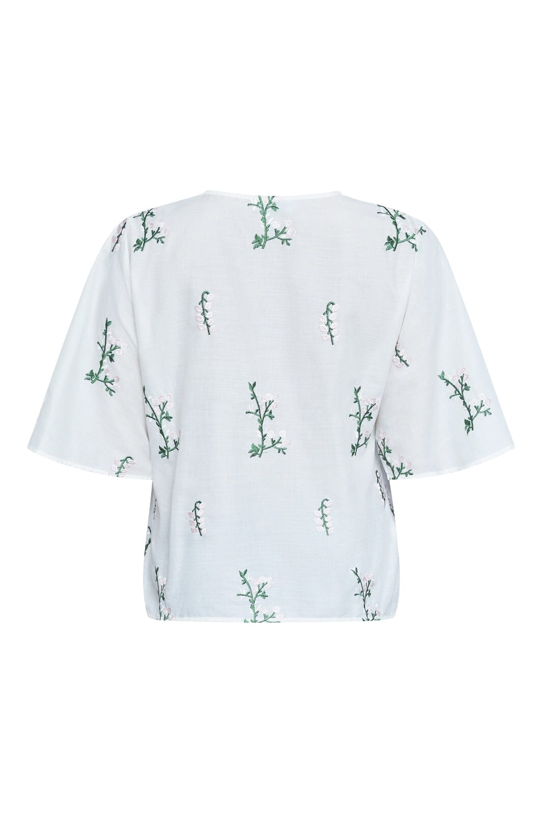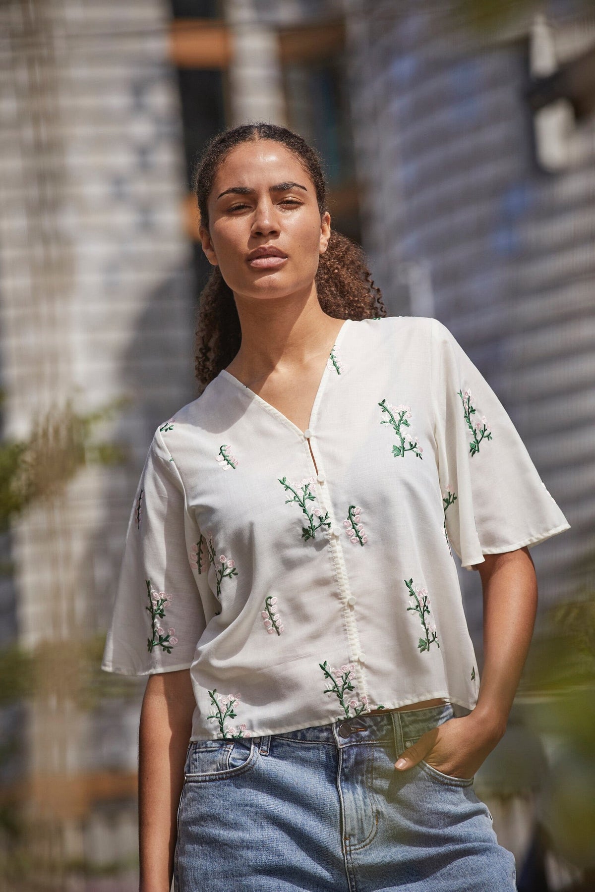 Kremfarget bluse fra Love & Divine med broderte blomster i rosa og grønne stilker. Blusen har en v-halsutskjæring, knappelukking foran og brede, korte ermer.