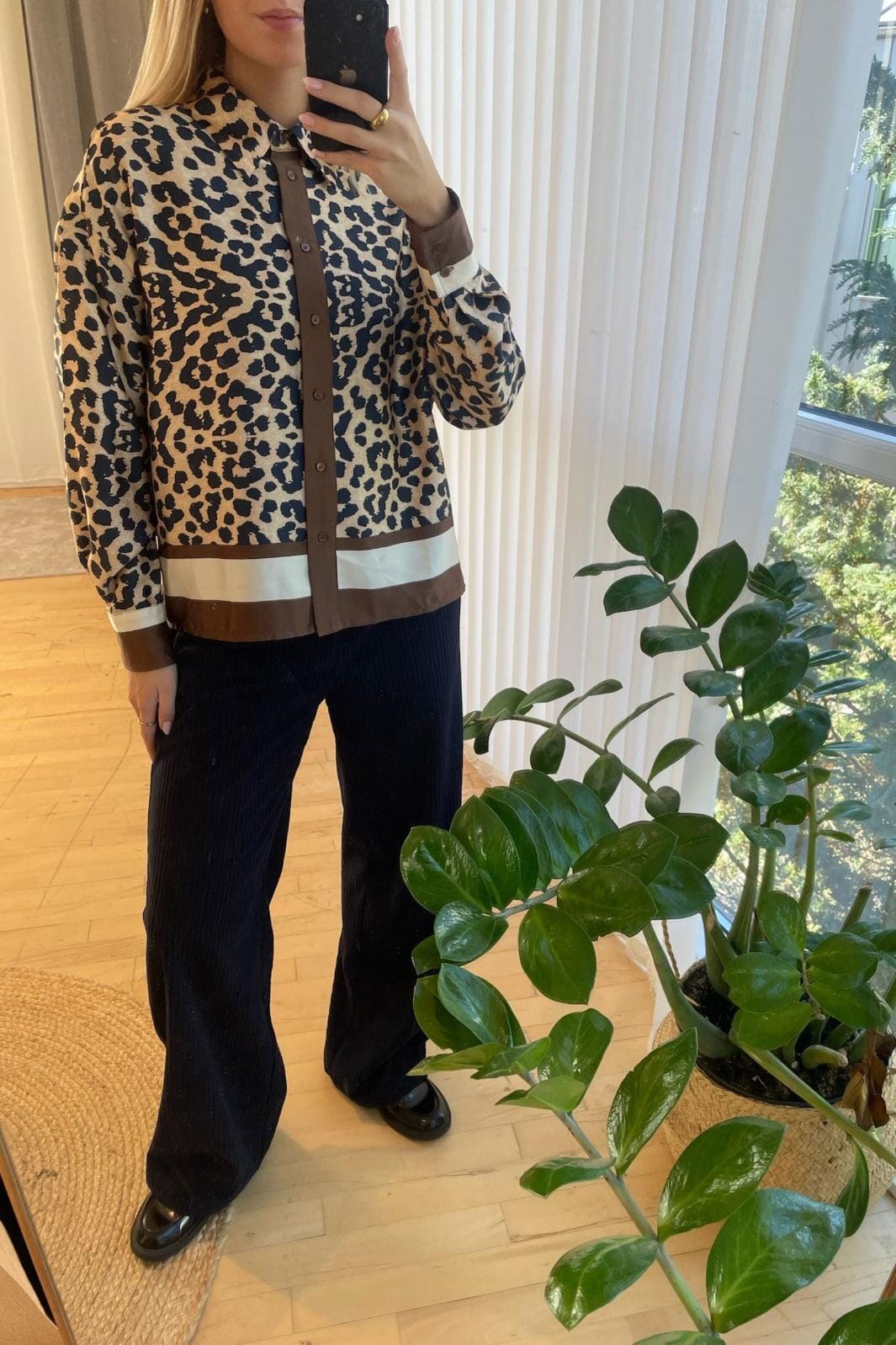 Skjorte fra Love & Divine med leopardmønster i brune nyanser kombinert med marineblå og brune detaljer. Skjorten har en klassisk krage og knappelukking.