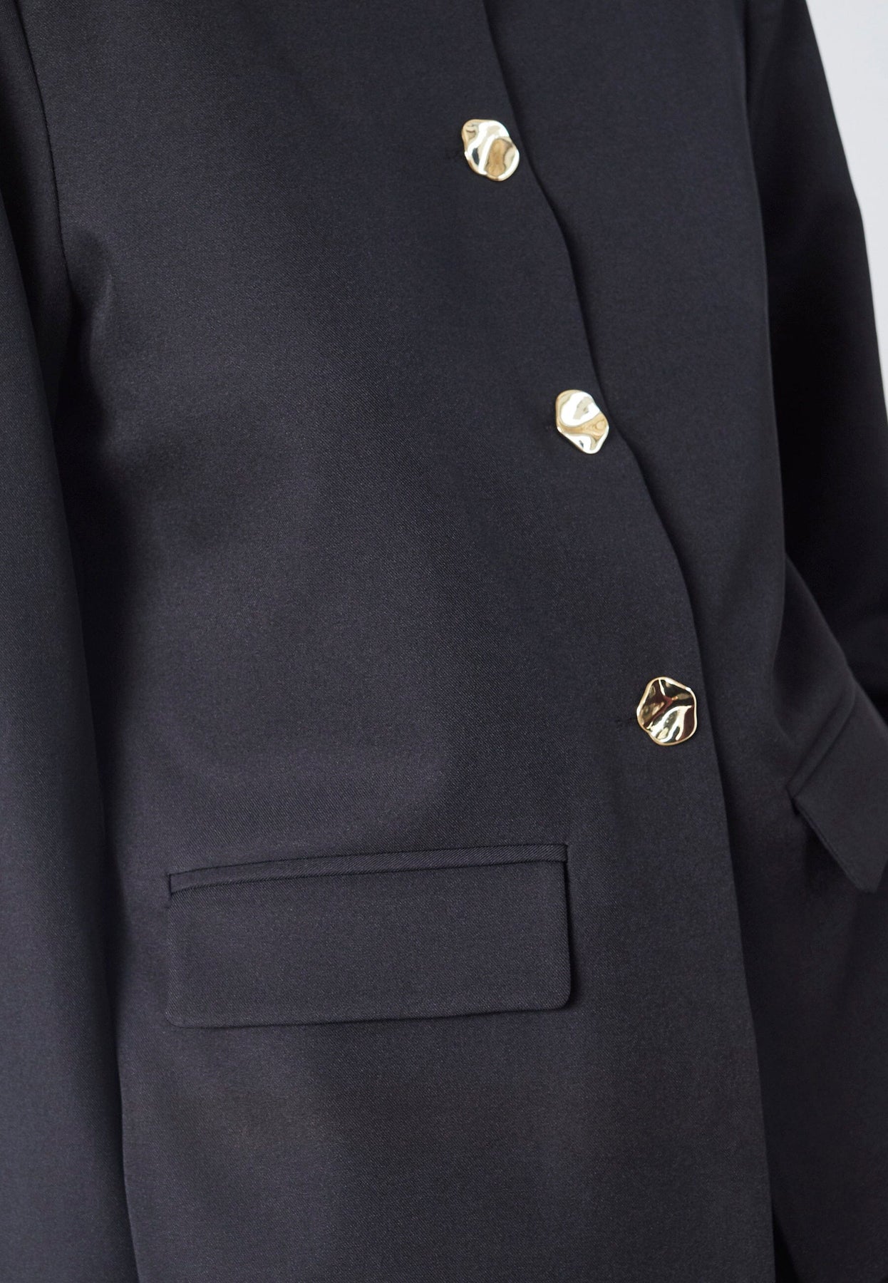 er en elegant blazer med rund hals og fire store, skinnende gullknapper. Perfekt for et stilfullt og formelt utseende. Modellen har størrelse S.