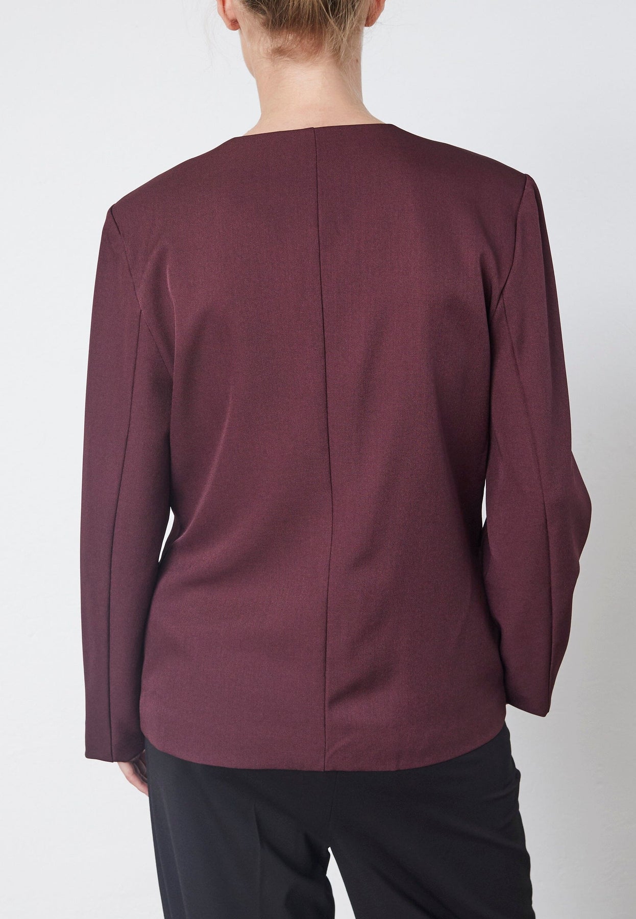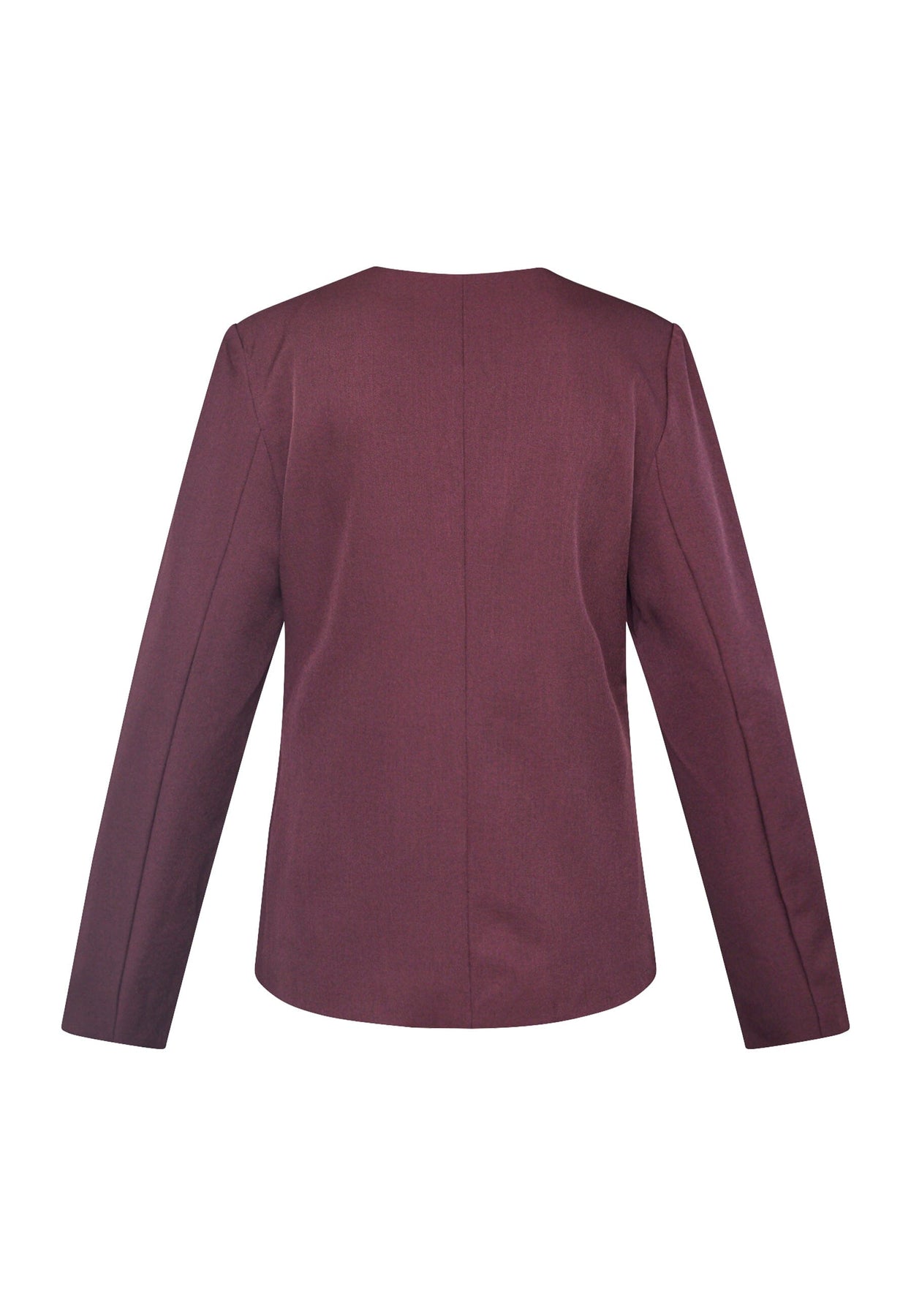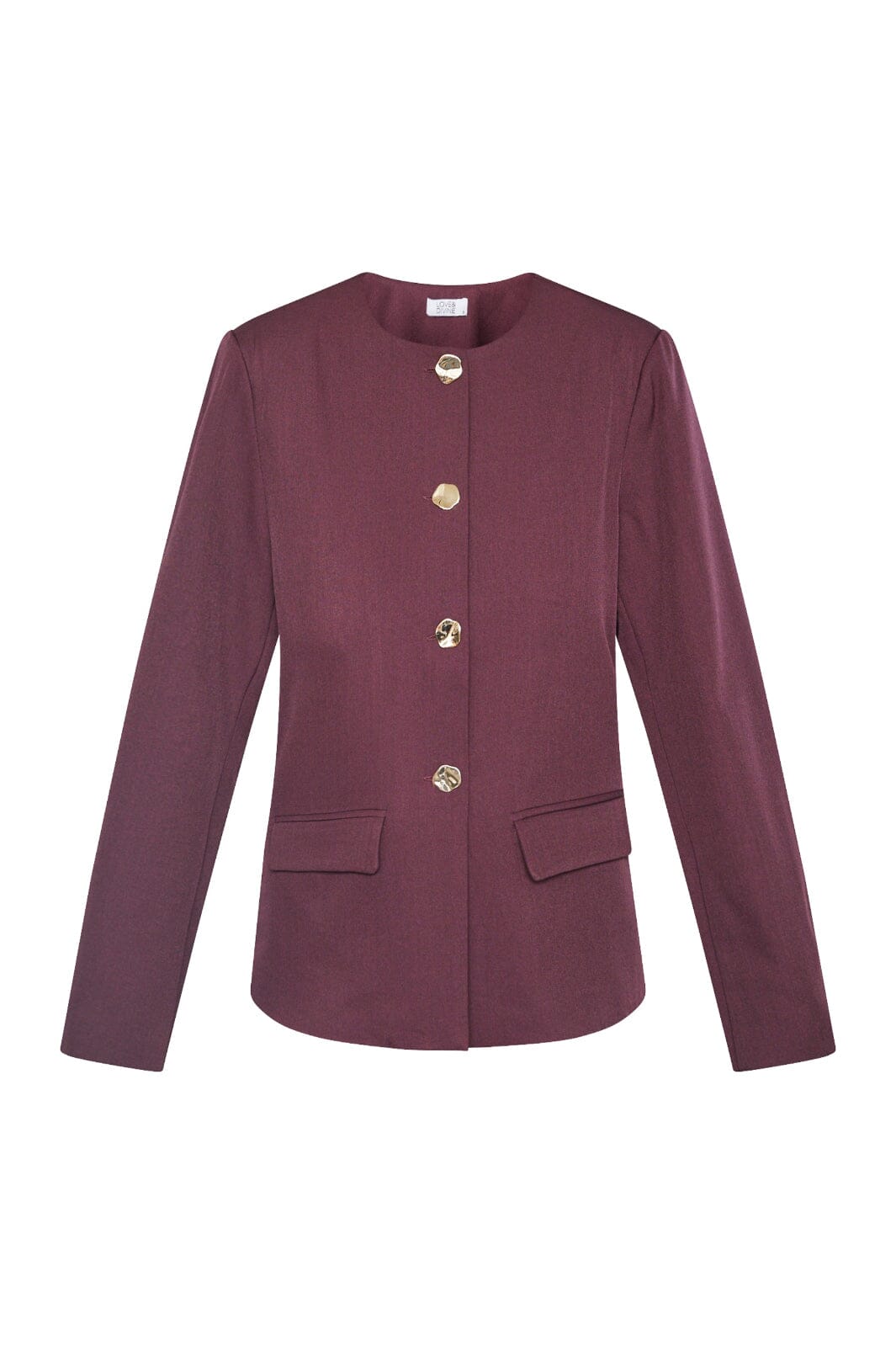 er en elegant blazer med rund hals og fire store, skinnende gullknapper. Perfekt for et stilfullt og formelt utseende. Modellen har størrelse S.