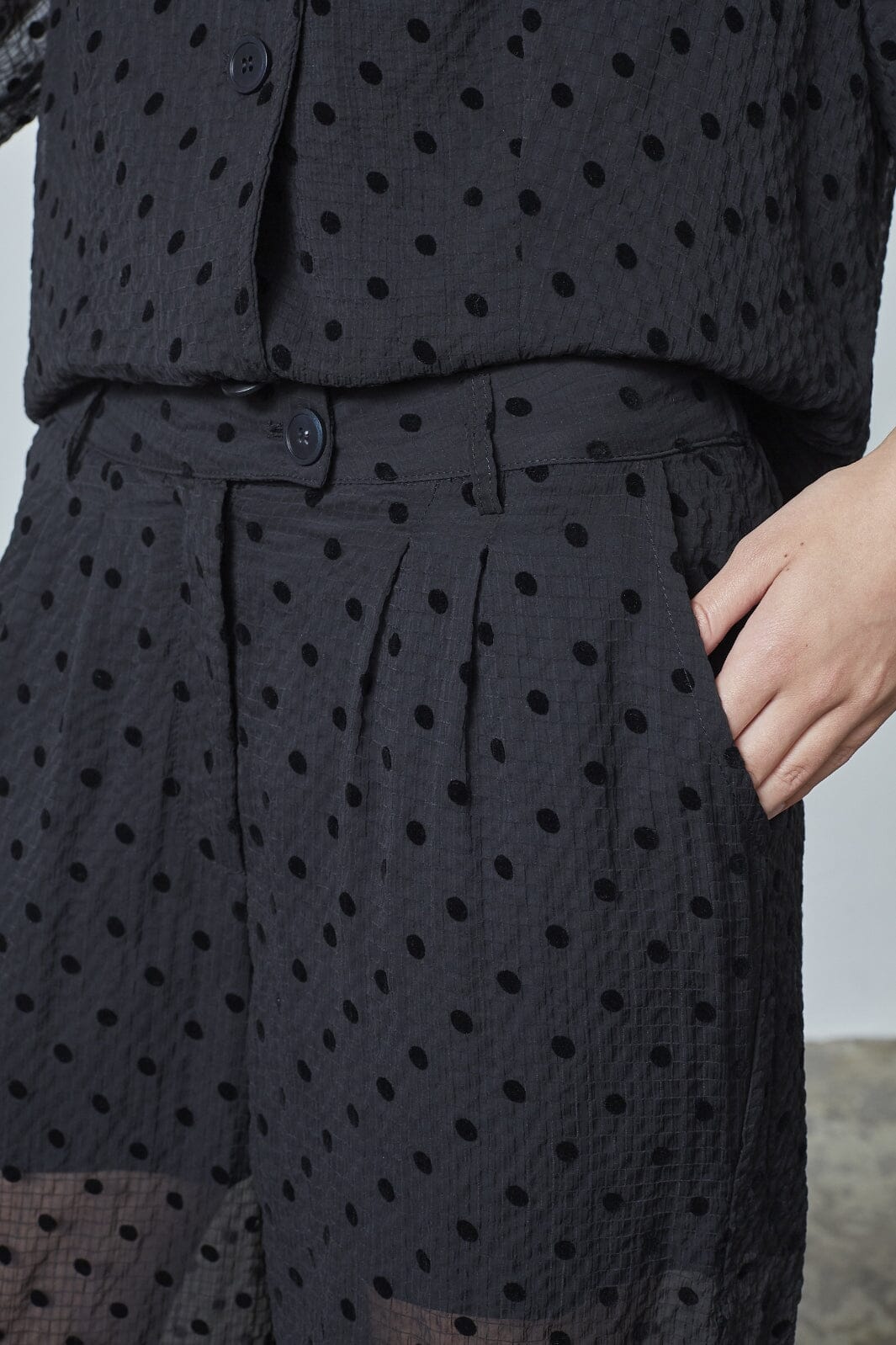 er et par bukser med en løs passform med et transparent, prikket lag som gir et unikt og elegant uttrykk. Modellen har størrelse S.