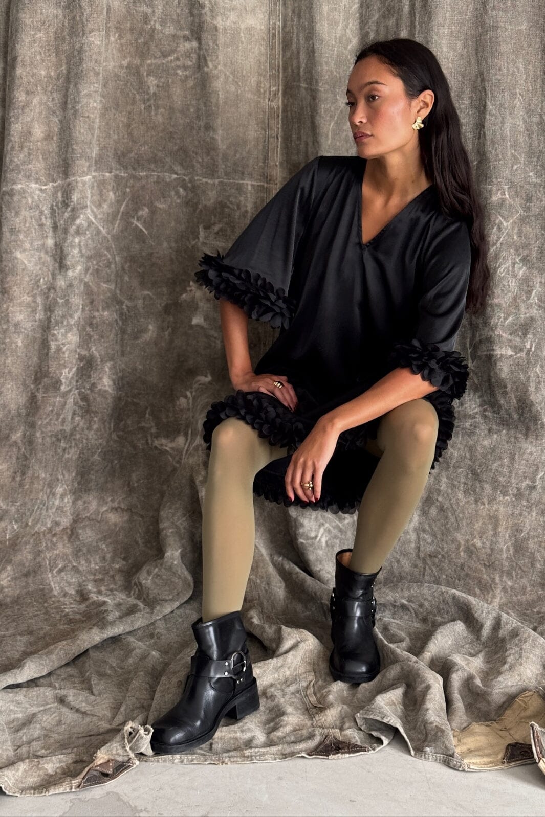 Sort kjole fra Love & Divine med volangdetaljer ved ermene og kanten. Kjolen har en V-utringning og 3/4-ermer.
