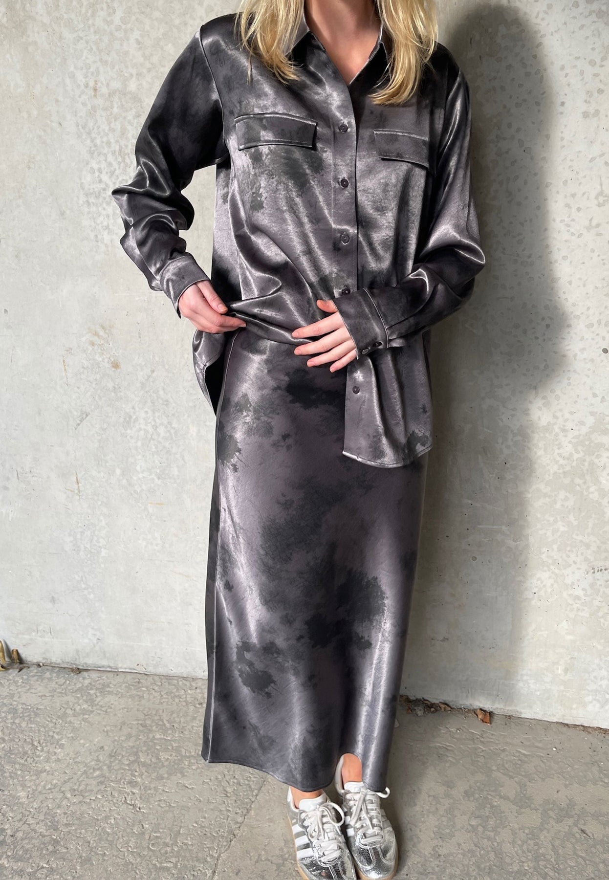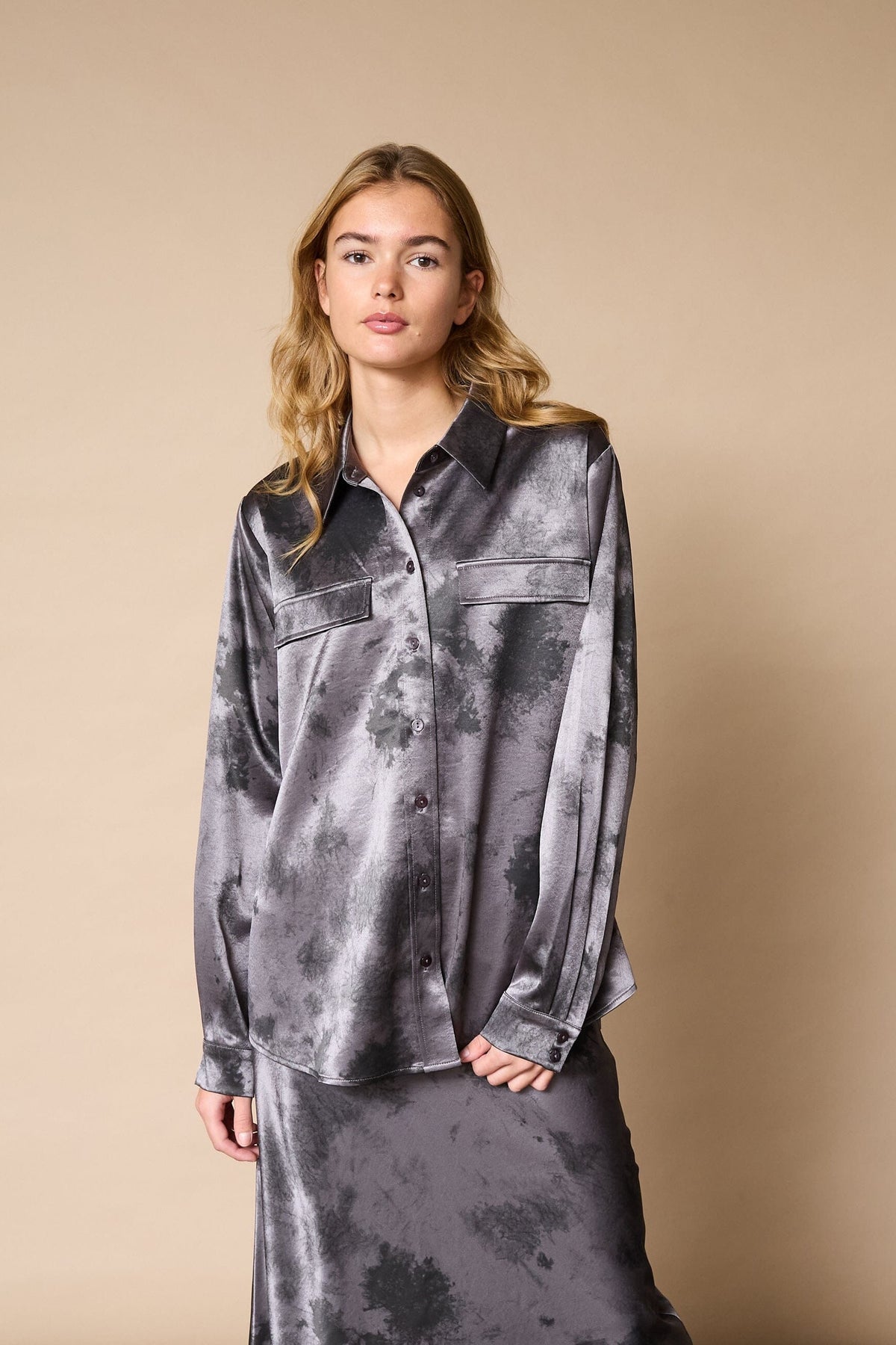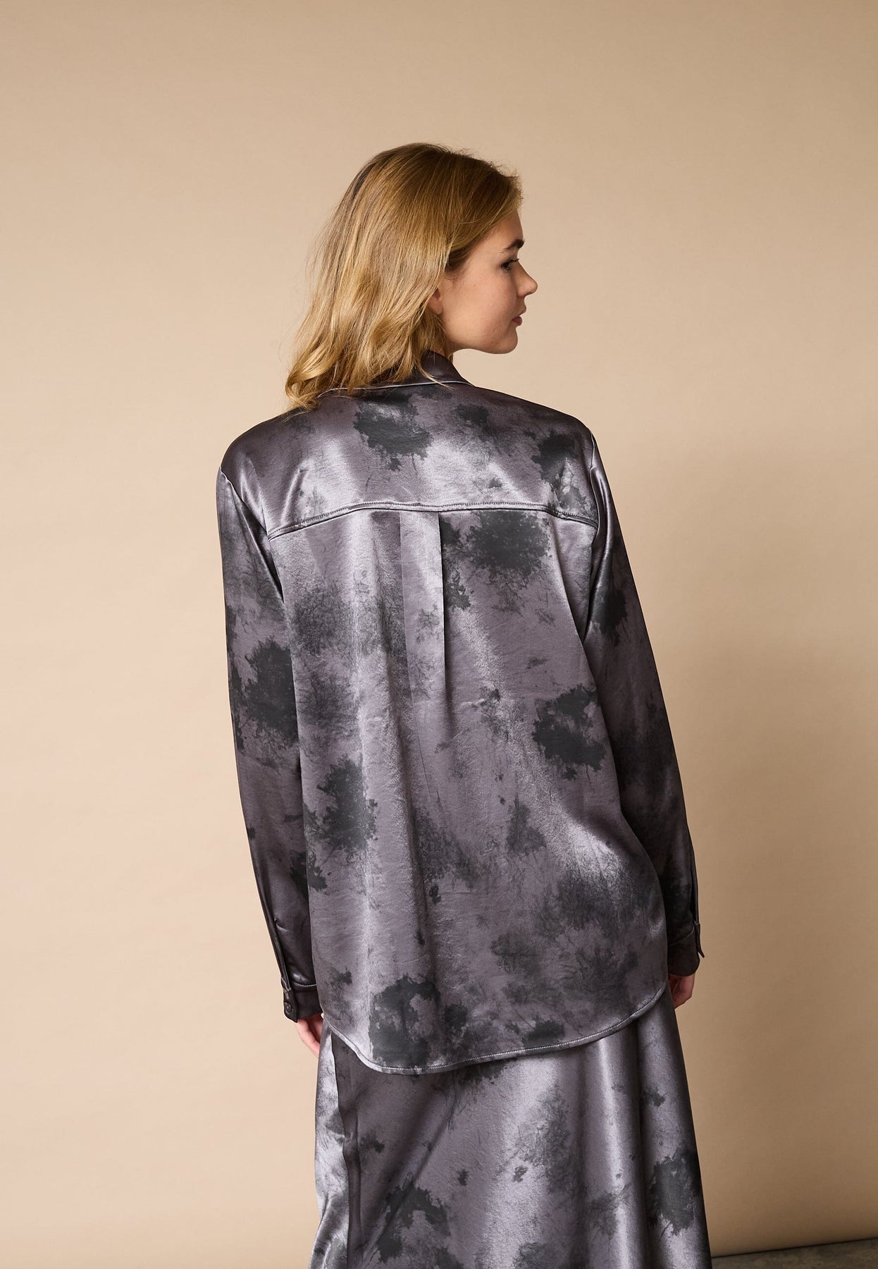 Skjorte fra Love & Divine i grå med et skinnende marmormønstret print. Skjorten har en oversized passform og klassisk skjortekrage.