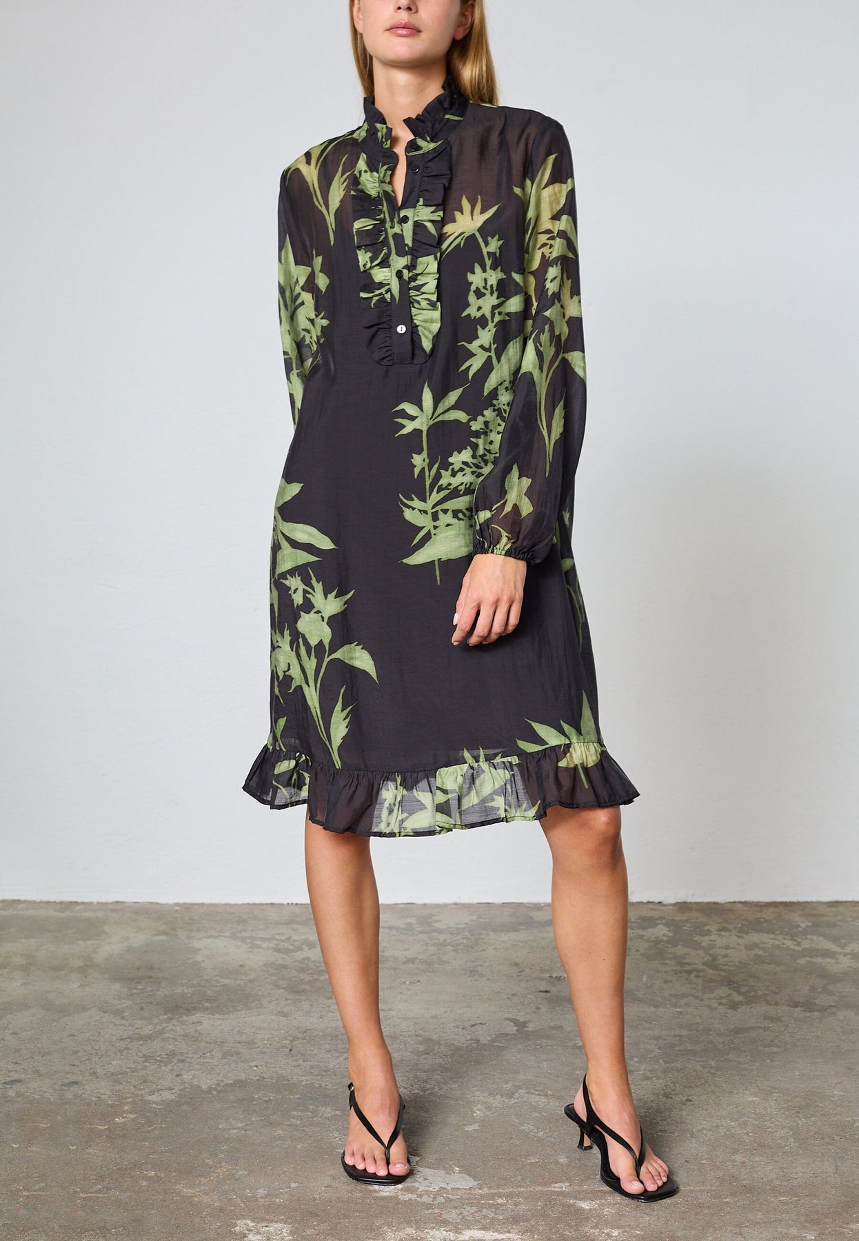 Knelang kjole fra Love & Divine med grønt bladmønster på mørk bakgrunn. Kjolen har en liten stående krage med volanger og lukkes med knapper.