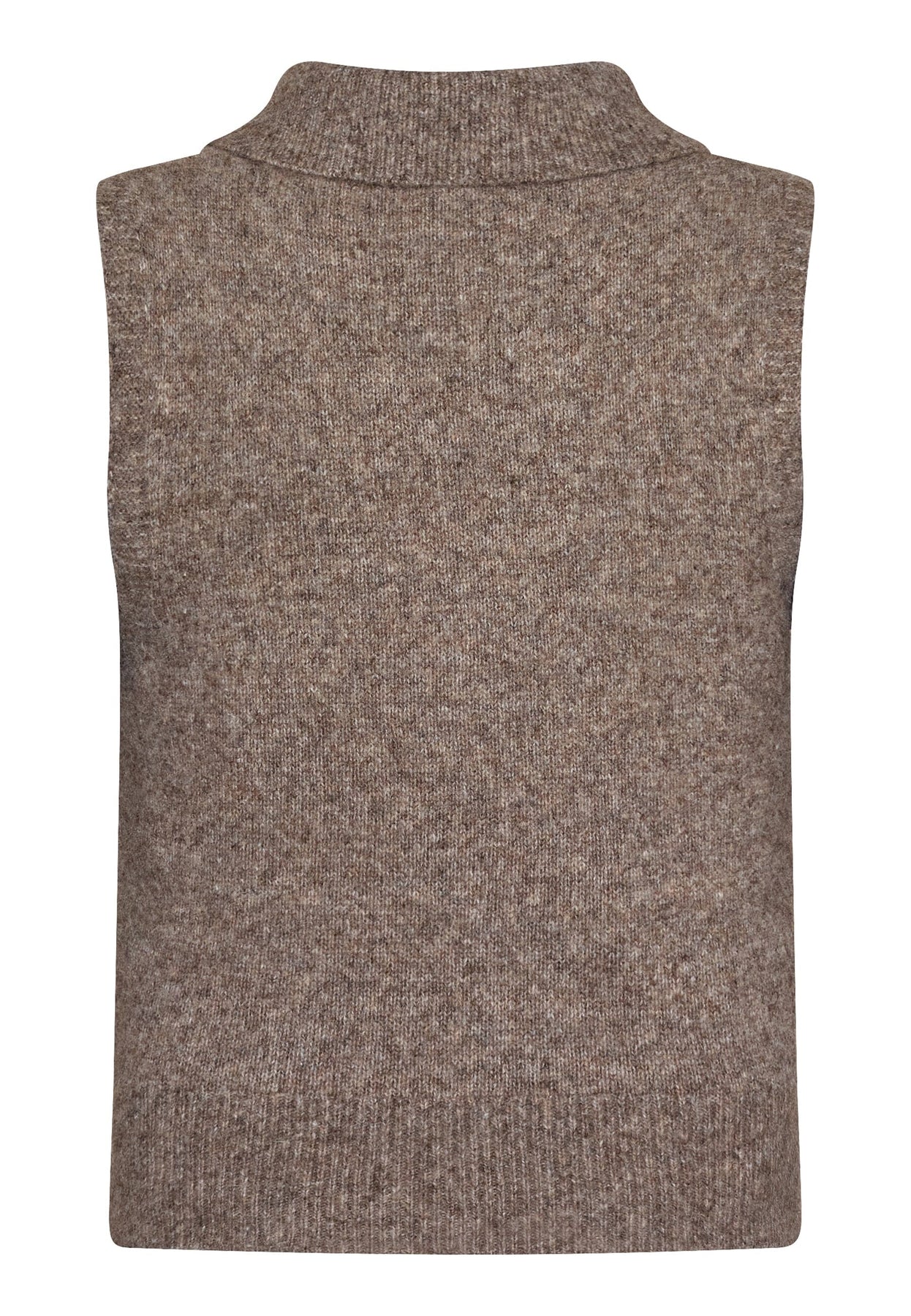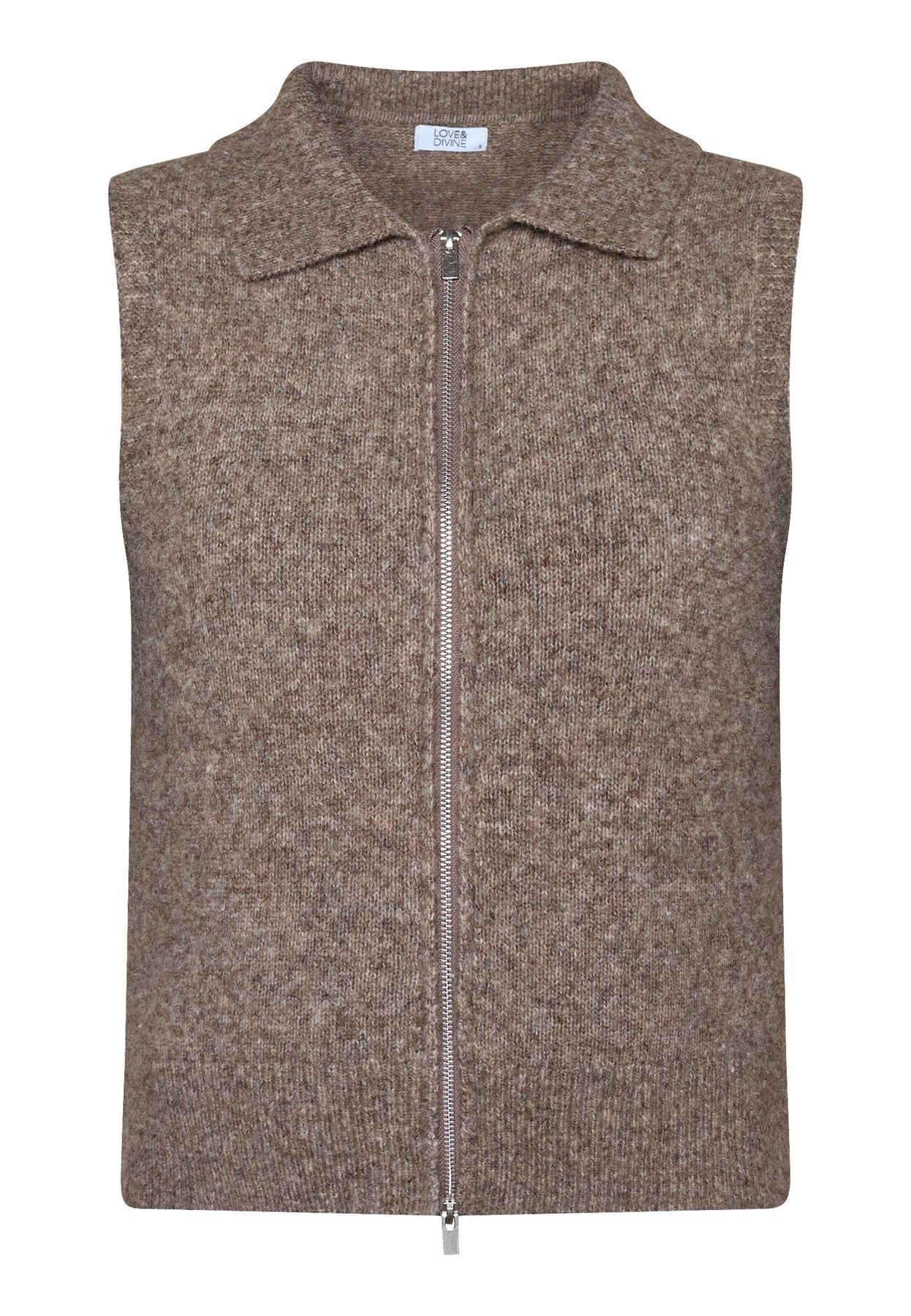 Ermeløs strikket vest fra Love & Divine i brun melert farge. Vesten har en polokrage og glidelås i full lengde foran.