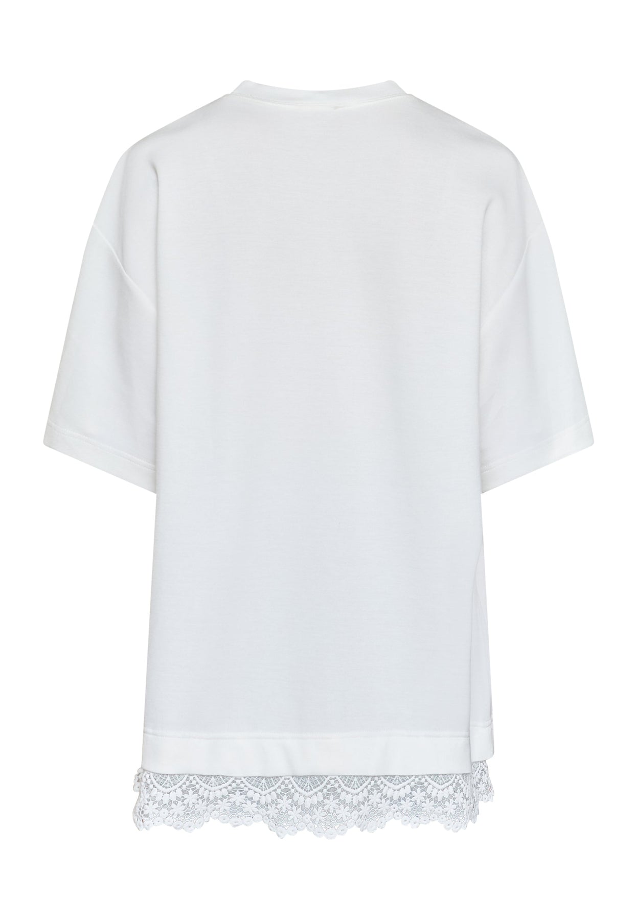 Hvit t-skjorte fra Love & Divine med påsydd blondekant langs nederkanten. Den har en oversized passform med korte ermer.
