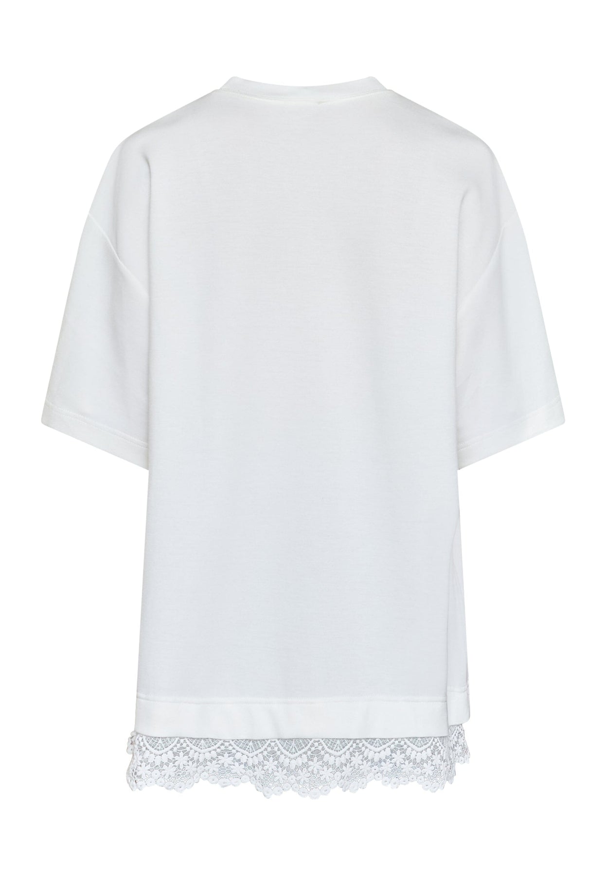 Hvit t-skjorte fra Love & Divine med påsydd blondekant langs nederkanten. Den har en oversized passform med korte ermer.