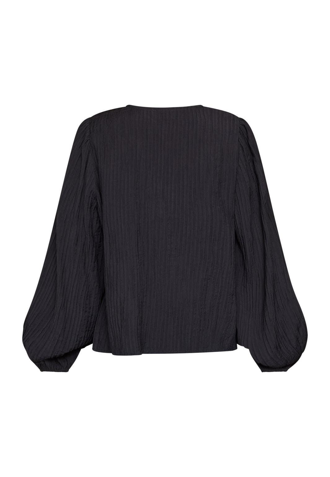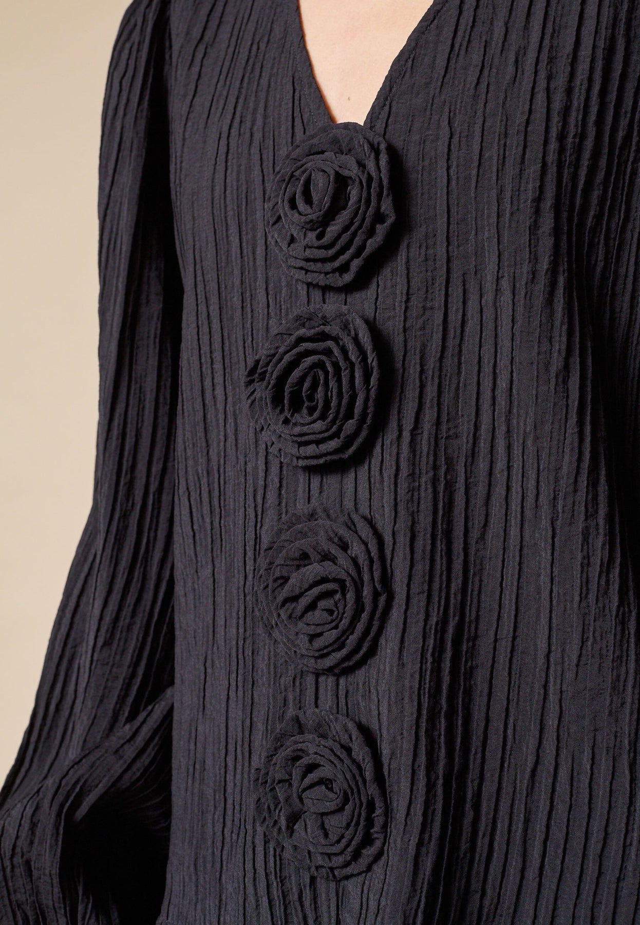 Sort bluse fra Love & Divine med fire dekorative blomsterlignende detaljer foran, lange ermer med lett puffede mansjetter og en V-utringning.